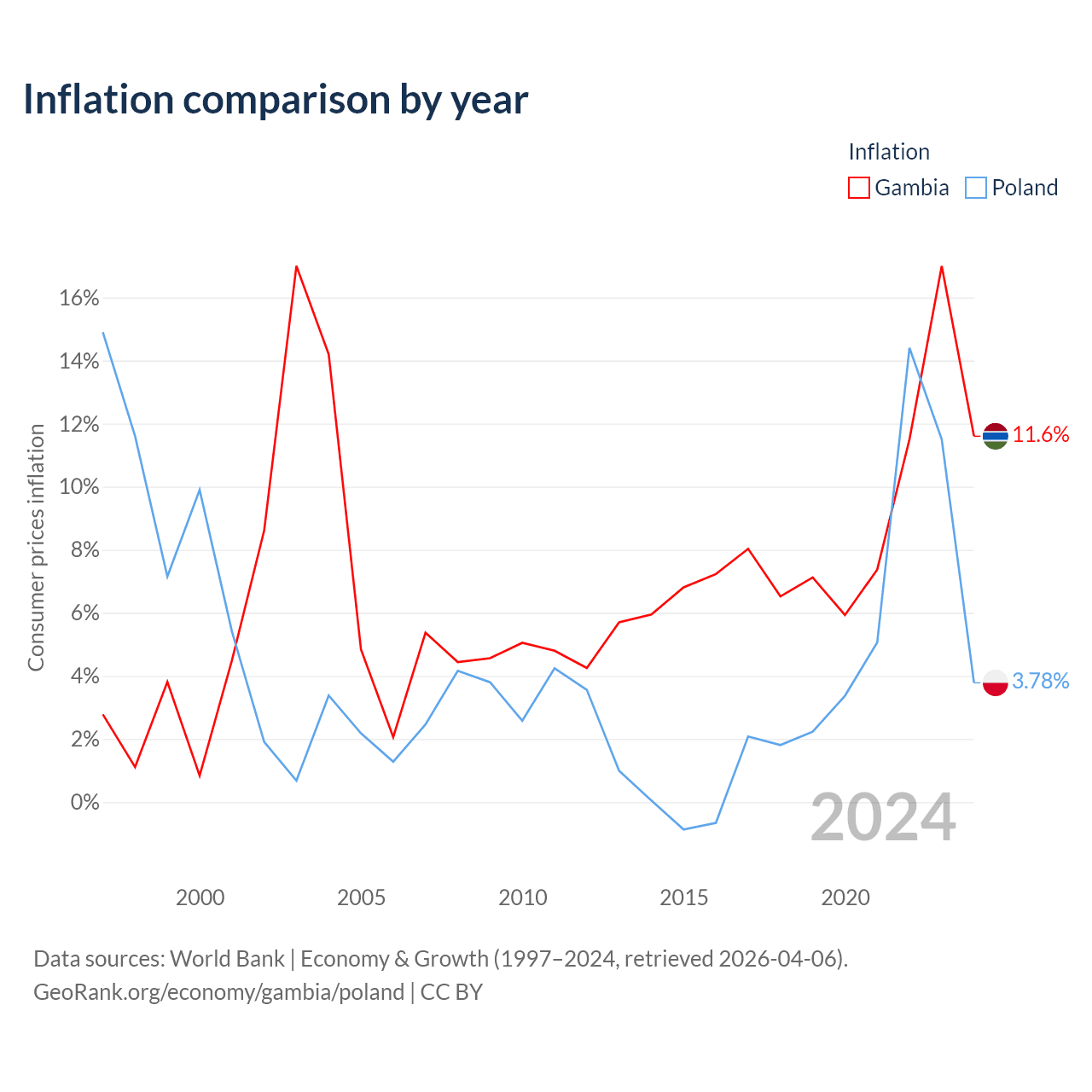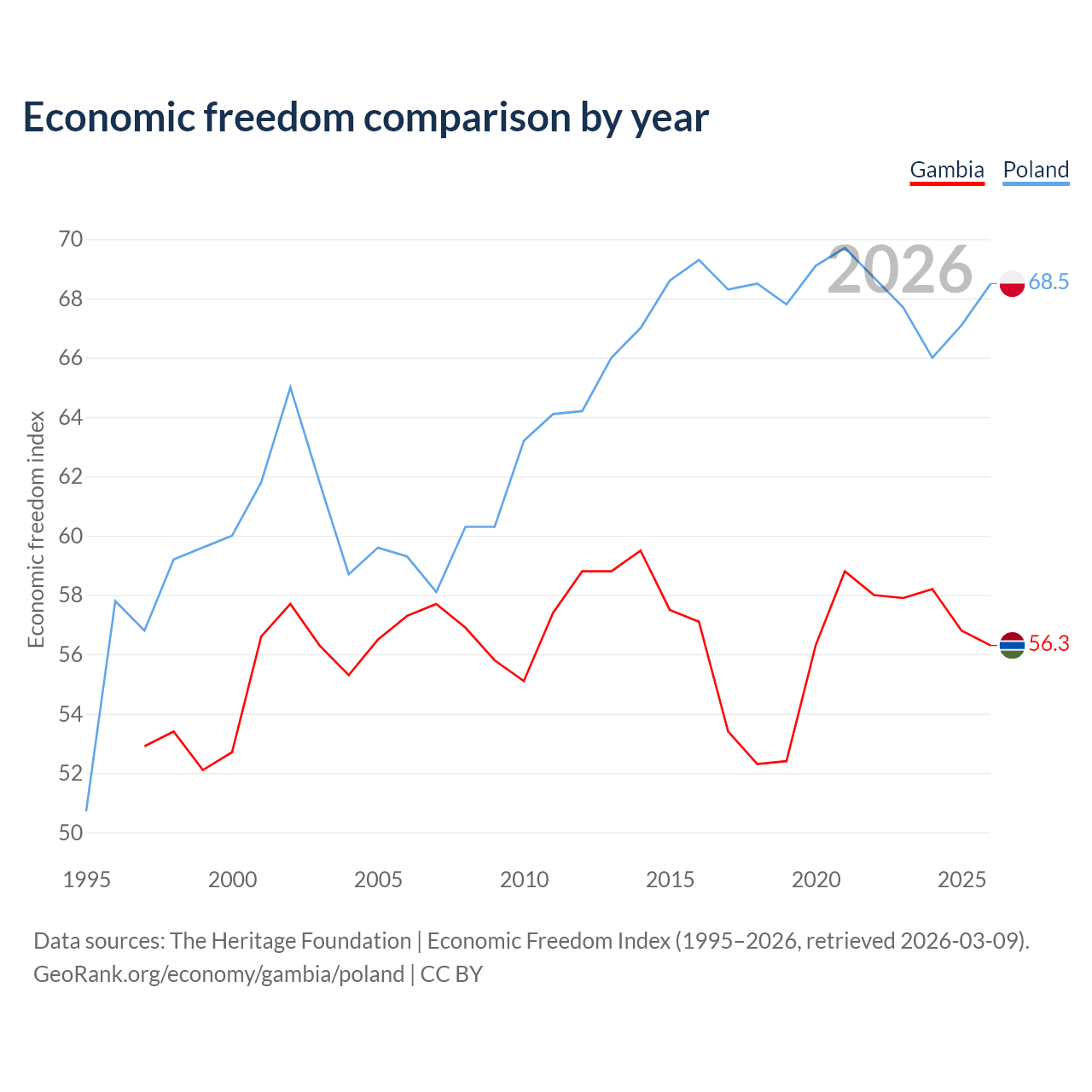 The Economic Freedom Index for the Gambia is 56.3, ranking 123/197, compared to 68.5 for Poland, ranking 46/197. The chart above displays a comparison of annual changes in economic freedom indexes.