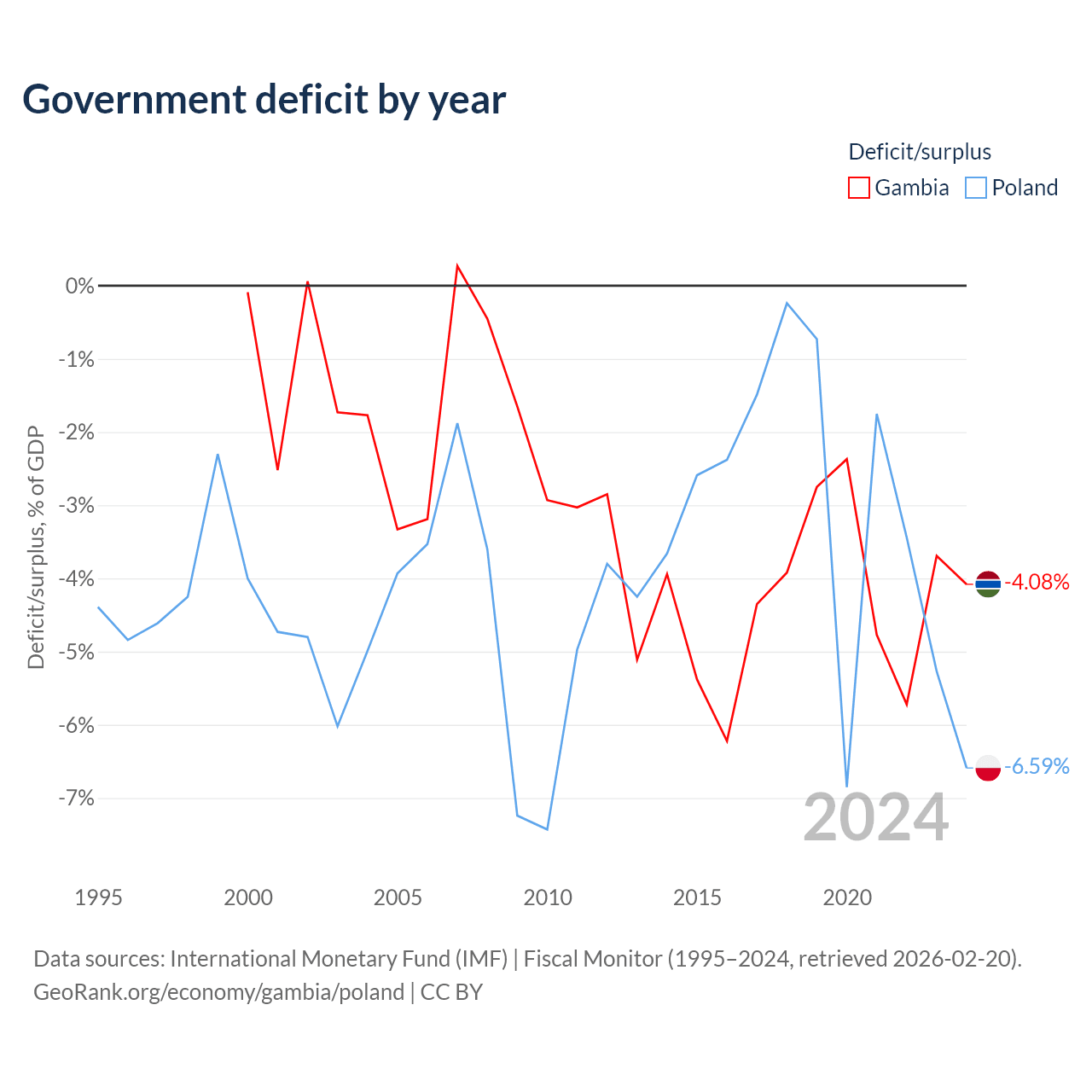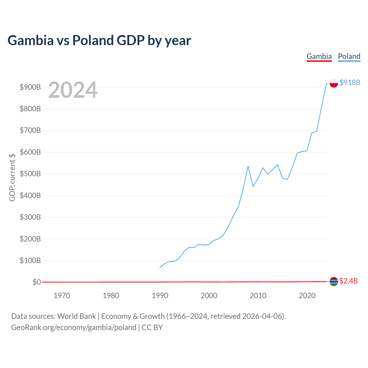 The Gambia has a GDP of $2.4B compared to $918B for Poland, ranking 174/197 and 21/197 by economy size, respectively.