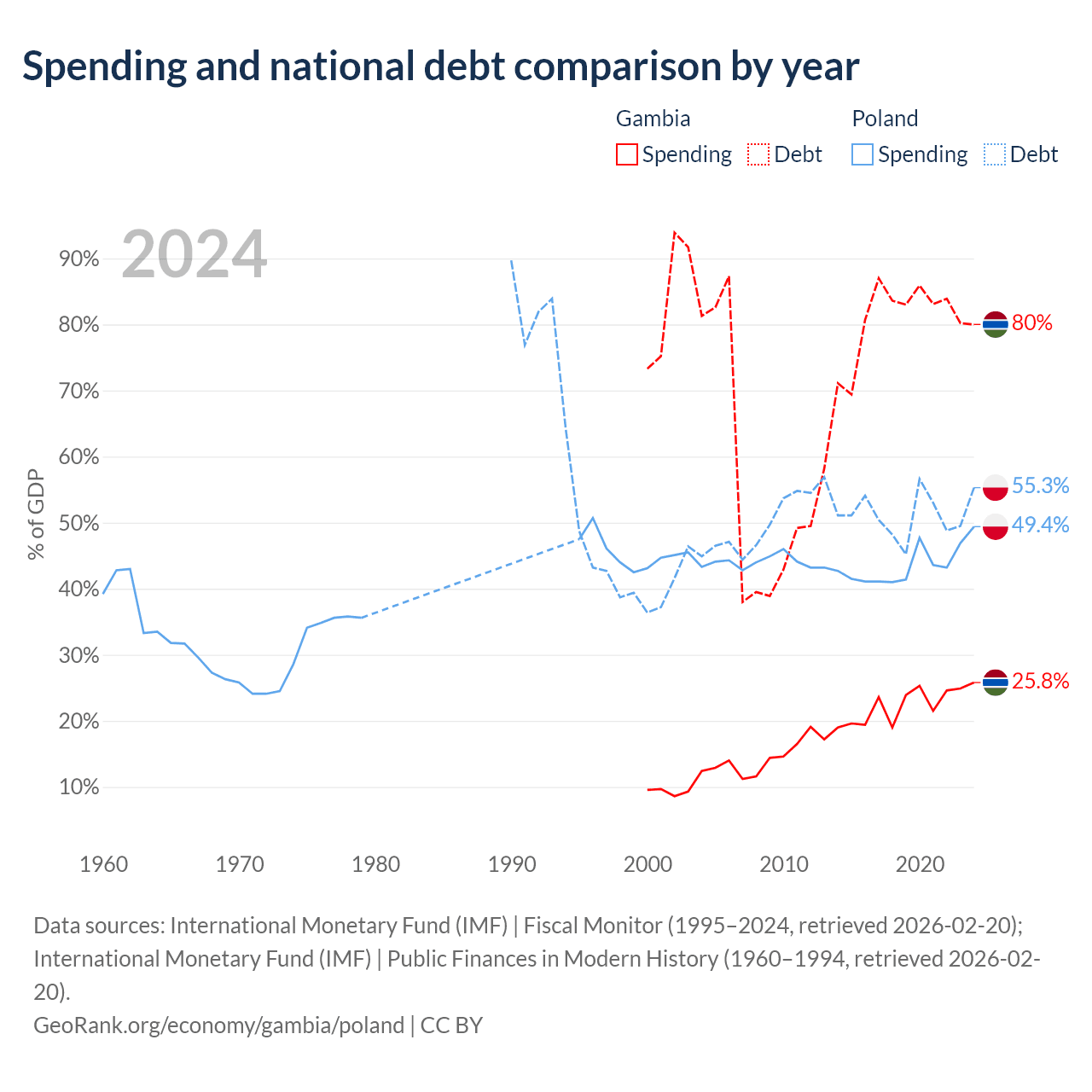The Gambia has $1.92B in government debt (80% of GDP), compared to $507B (55.3% of GDP) in Poland.