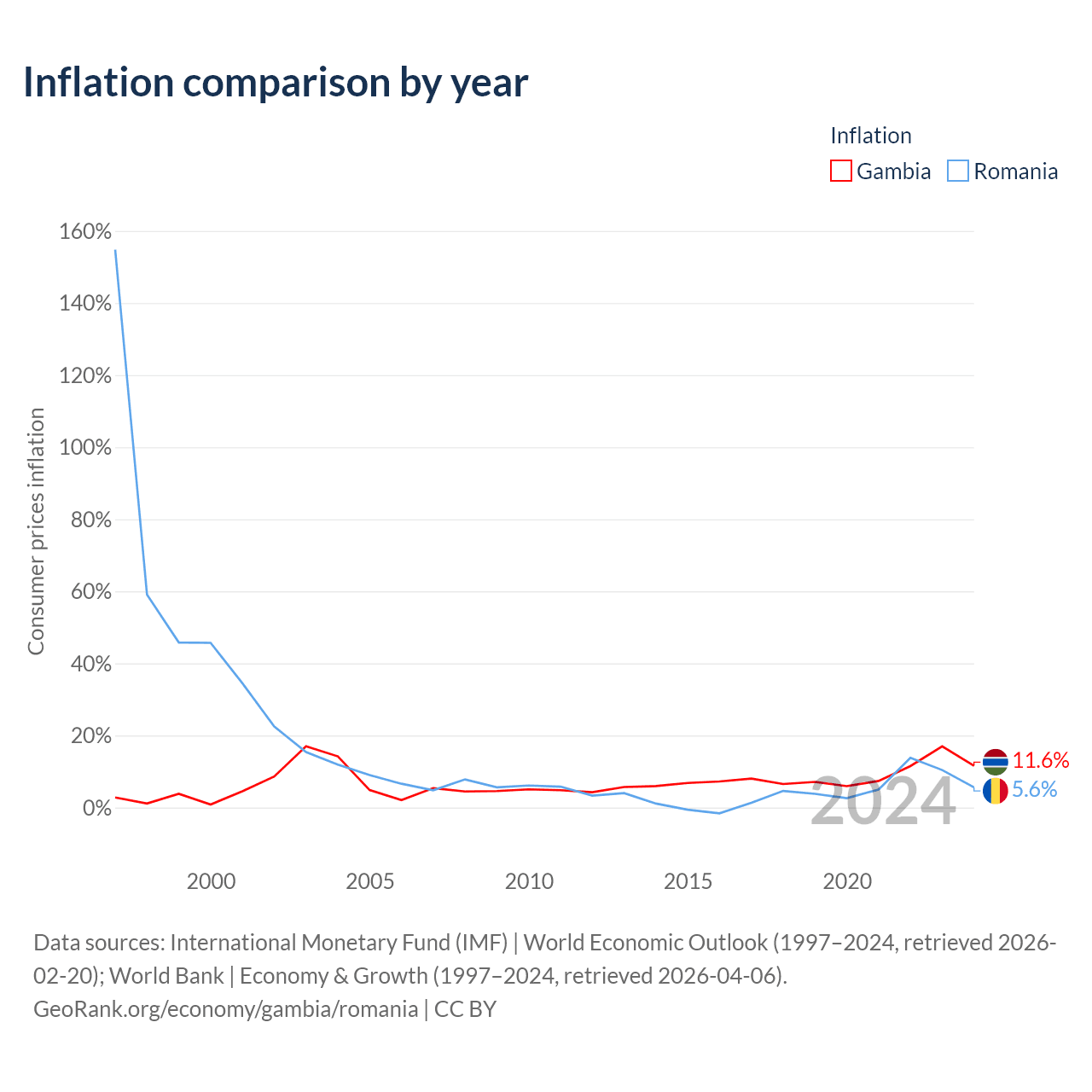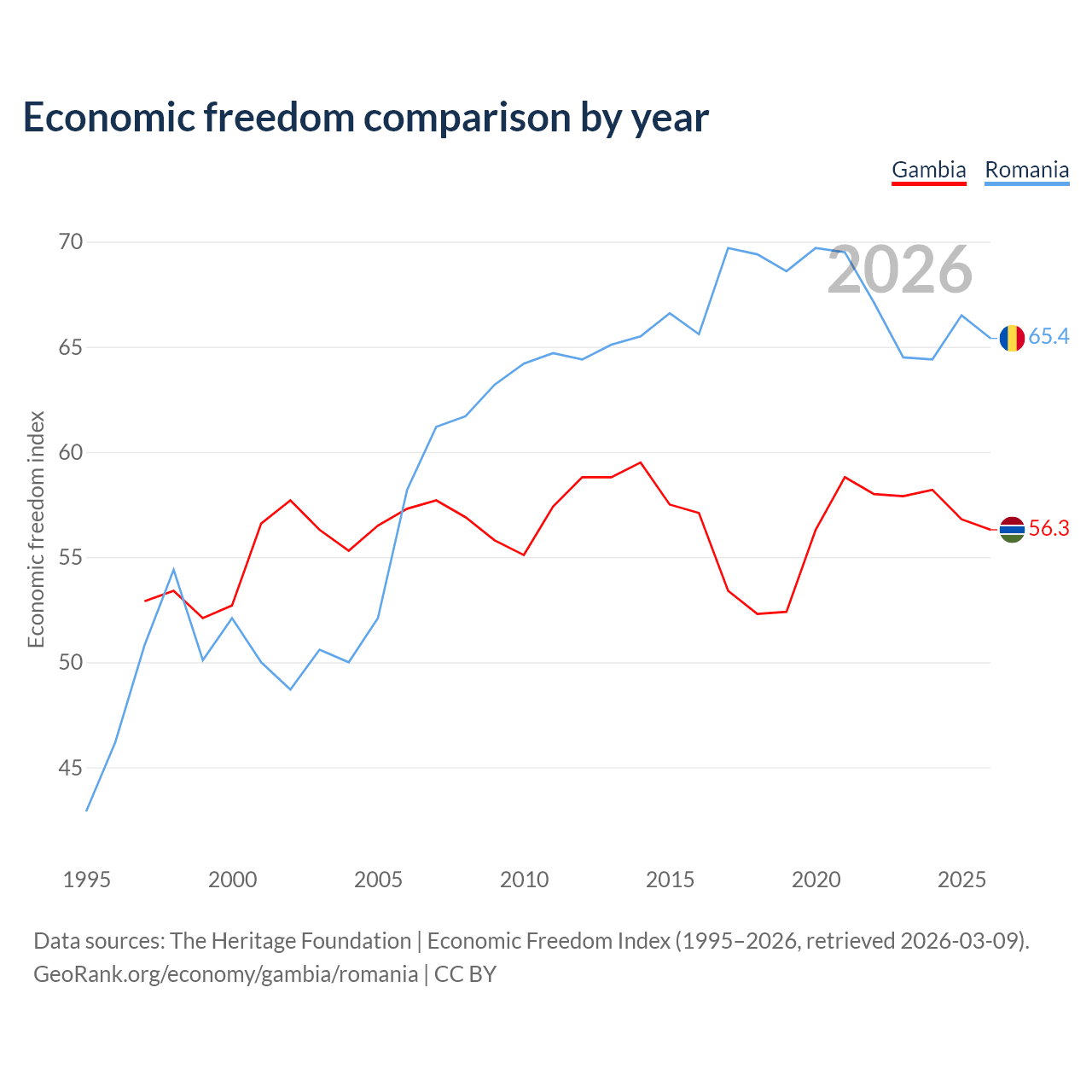 The Economic Freedom Index for the Gambia is 56.3, ranking 123/197, compared to 65.4 for Romania, ranking 64/197. The chart above displays a comparison of annual changes in economic freedom indexes.