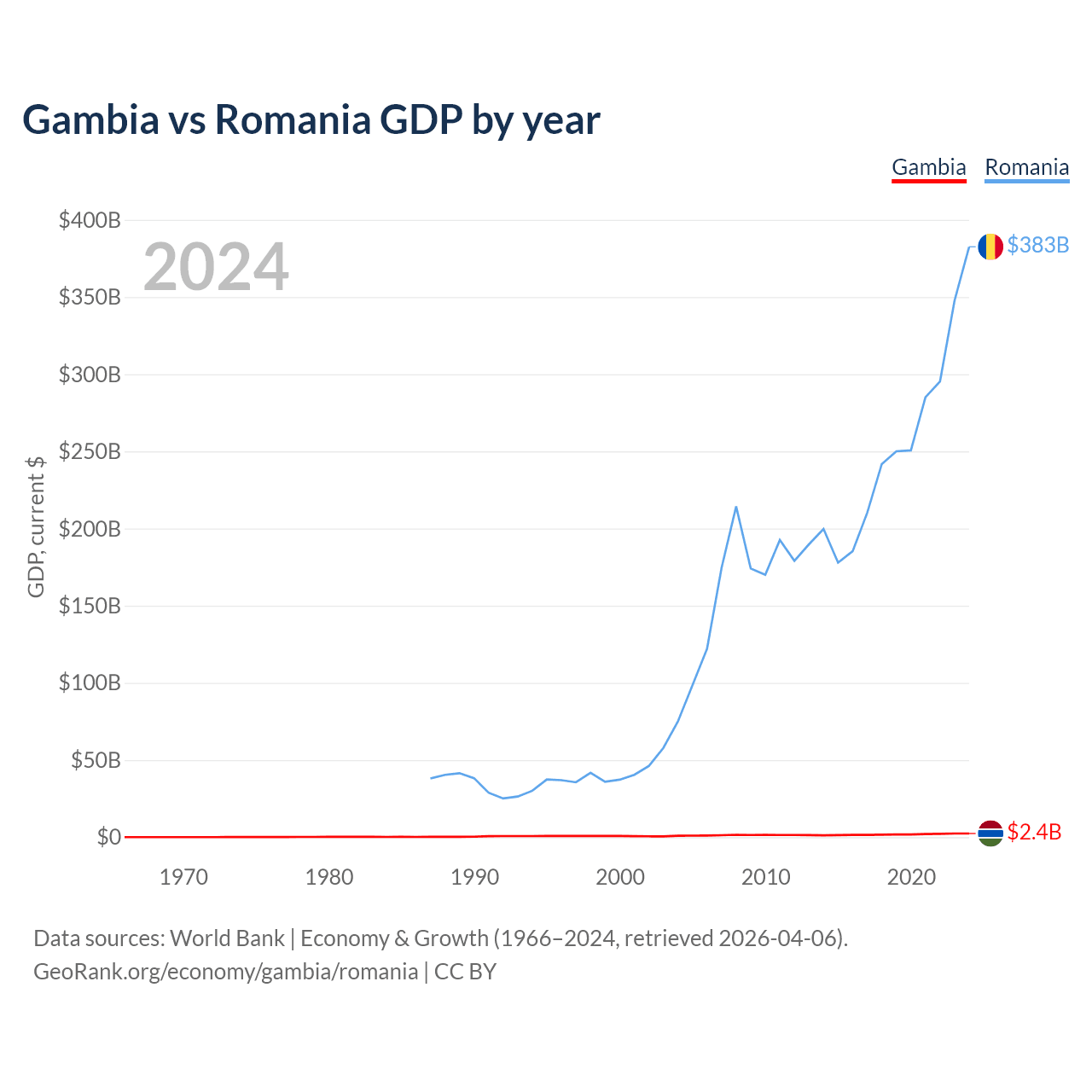 The Gambia has a GDP of $2.4B compared to $383B for Romania, ranking 174/197 and 42/197 by economy size, respectively.