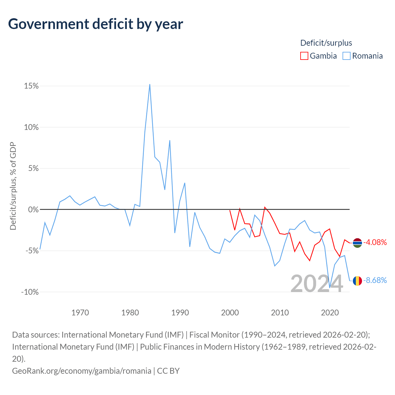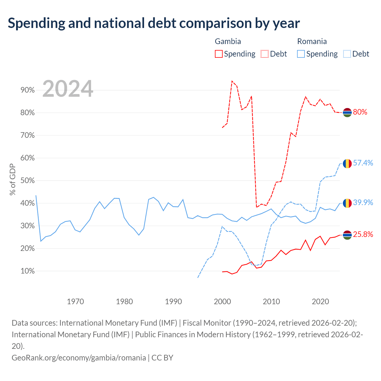 The Gambia has $1.92B in government debt (80% of GDP), compared to $220B (57.4% of GDP) in Romania.