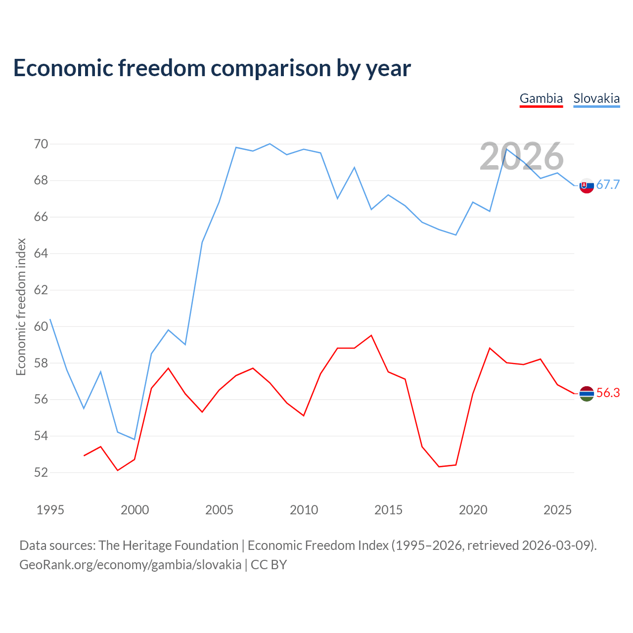 The Economic Freedom Index for the Gambia is 56.3, ranking 123/197, compared to 67.7 for Slovakia, ranking 54/197. The chart above displays a comparison of annual changes in economic freedom indexes.