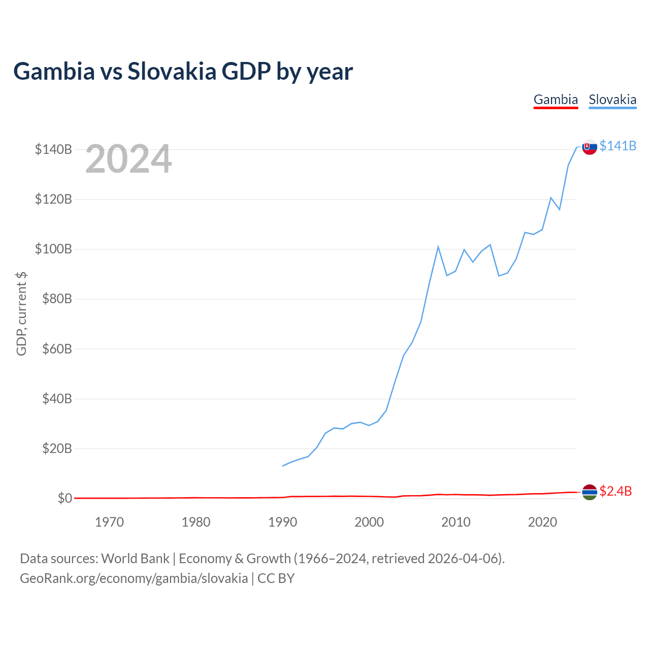 The Gambia has a GDP of $2.4B compared to $141B for Slovakia, ranking 174/197 and 61/197 by economy size, respectively.