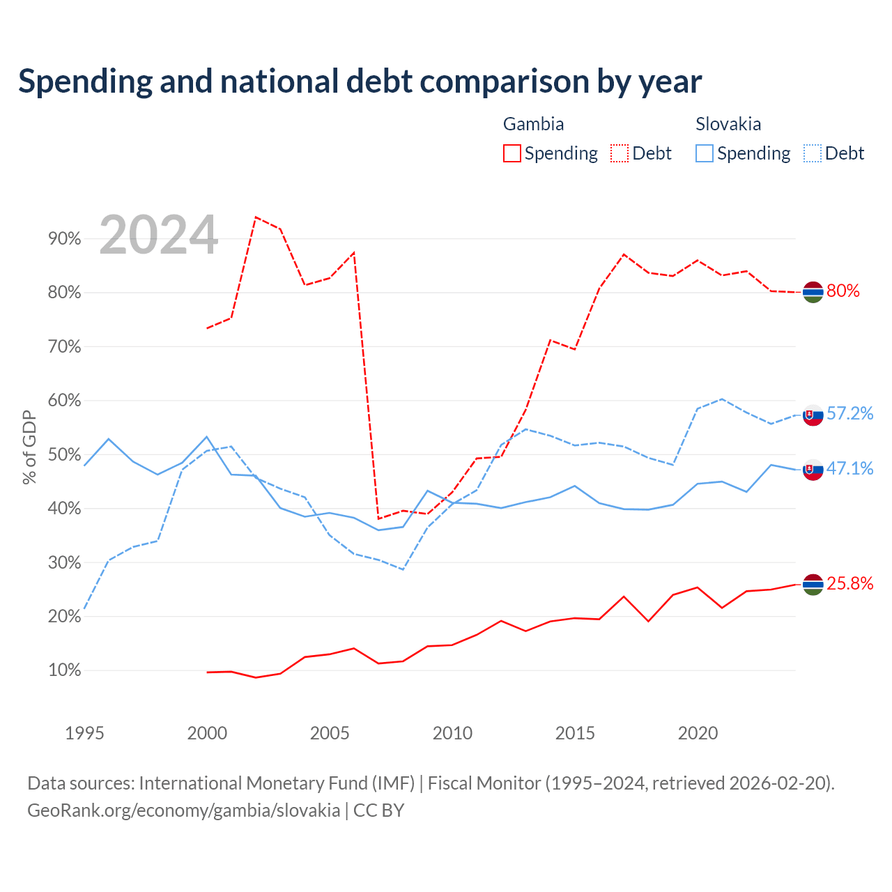 The Gambia has $1.92B in government debt (80% of GDP), compared to $80.7B (57.2% of GDP) in Slovakia.