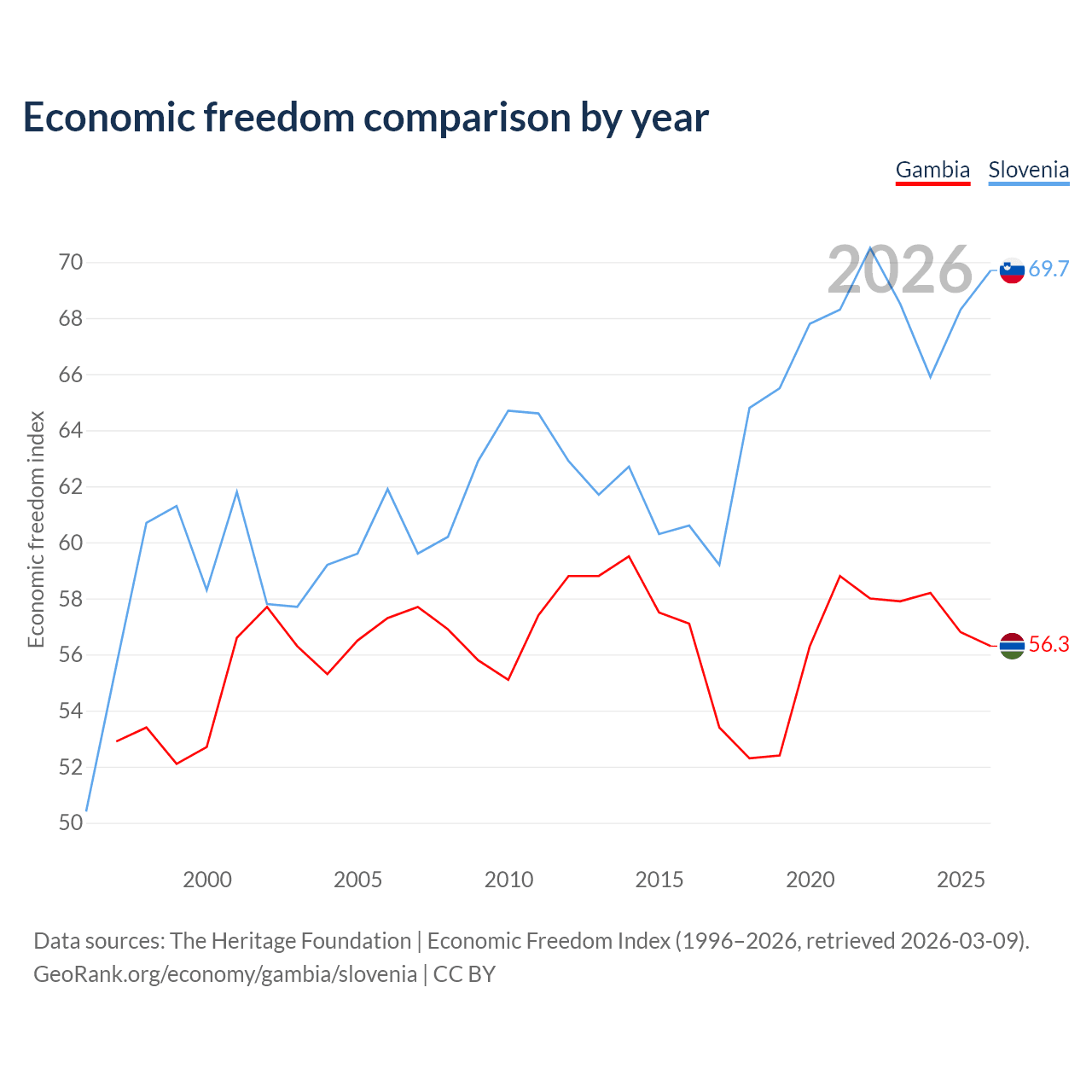The Economic Freedom Index for the Gambia is 56.3, ranking 123/197, compared to 69.7 for Slovenia, ranking 40/197. The chart above displays a comparison of annual changes in economic freedom indexes.