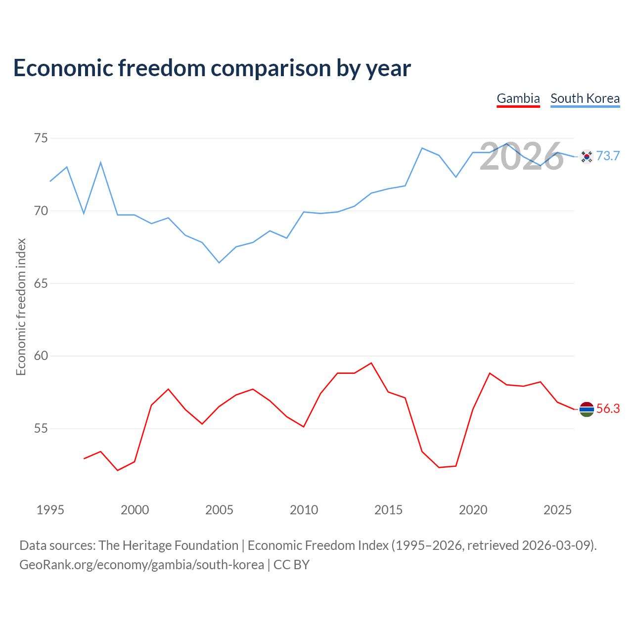 The Economic Freedom Index for the Gambia is 56.3, ranking 123/197, compared to 73.7 for South Korea, ranking 24/197. The chart above displays a comparison of annual changes in economic freedom indexes.