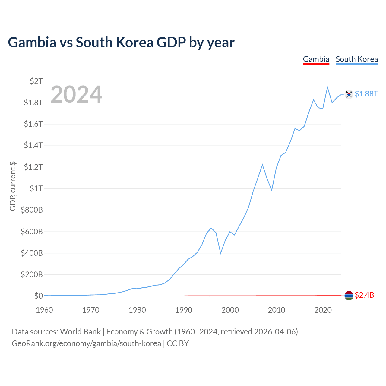 The Gambia has a GDP of $2.4B compared to $1.88T for South Korea, ranking 174/197 and 12/197 by economy size, respectively.