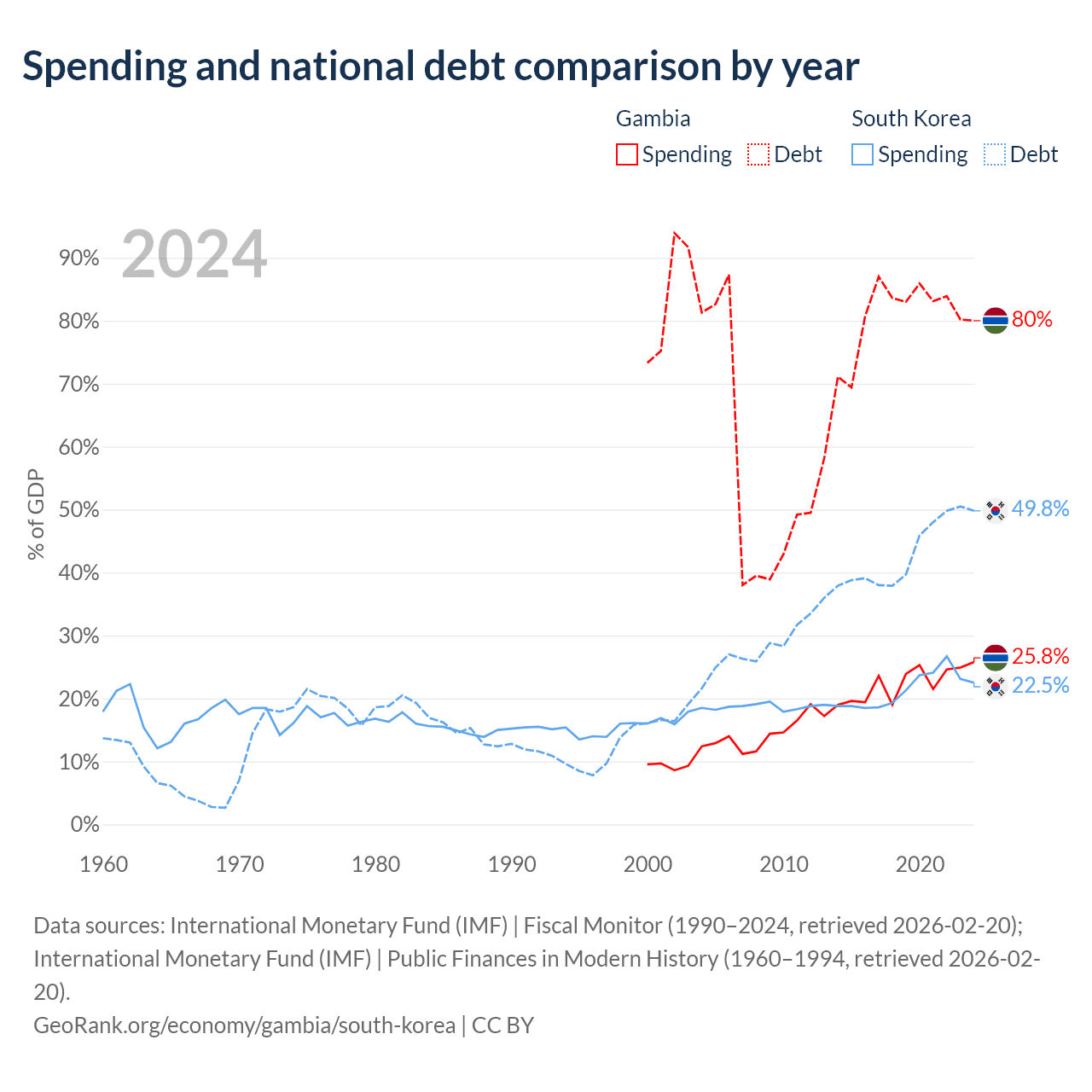 The Gambia has $1.92B in government debt (80% of GDP), compared to $934B (49.8% of GDP) in South Korea.