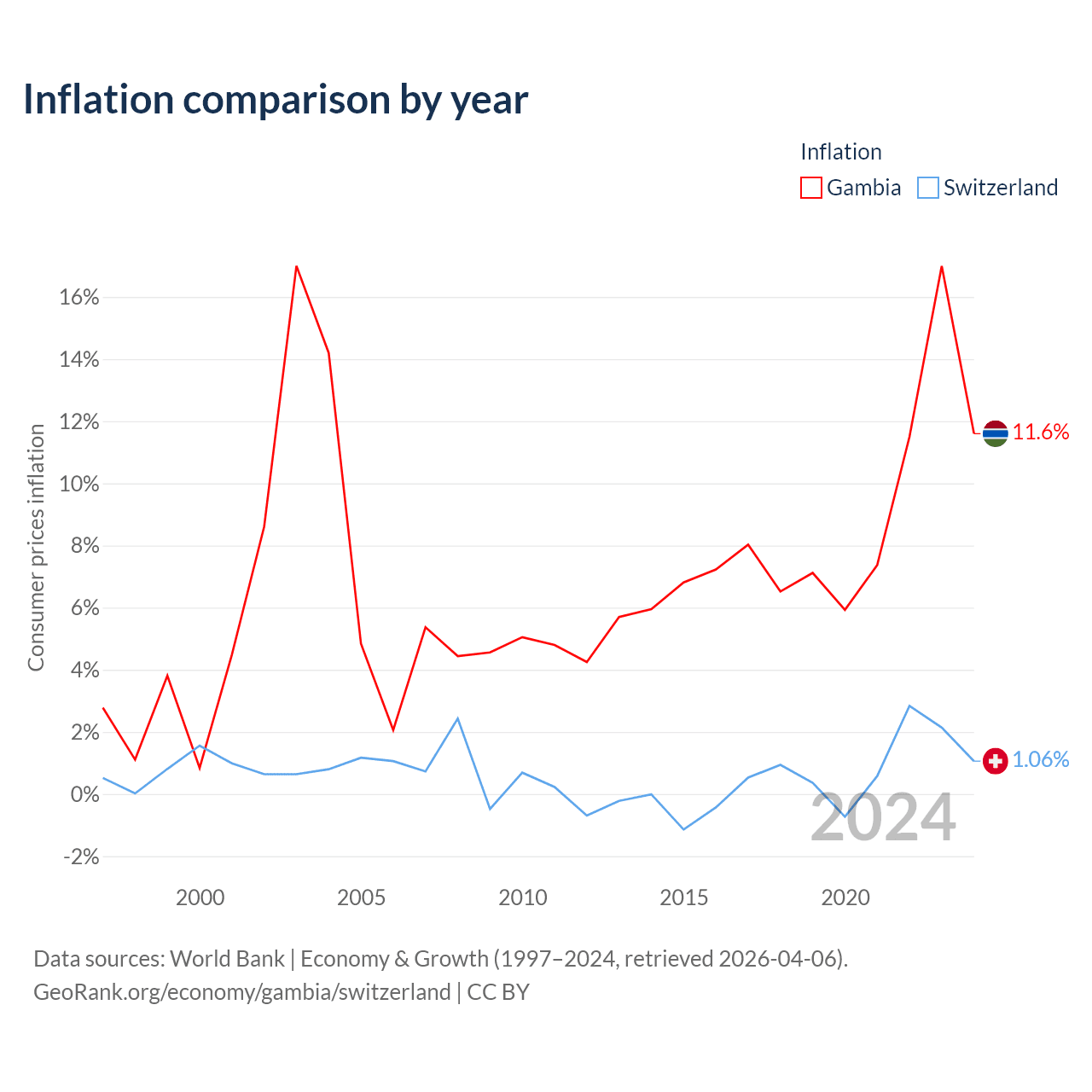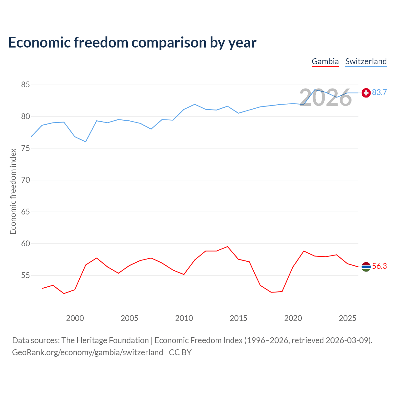 The Economic Freedom Index for the Gambia is 56.3, ranking 123/197, compared to 83.7 for Switzerland, ranking 2/197. The chart above displays a comparison of annual changes in economic freedom indexes.