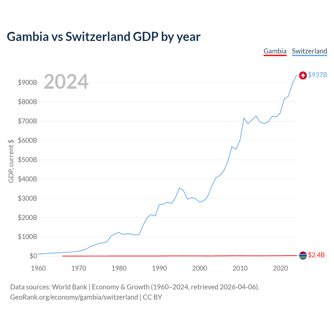 The Gambia has a GDP of $2.4B compared to $937B for Switzerland, ranking 174/197 and 20/197 by economy size, respectively.