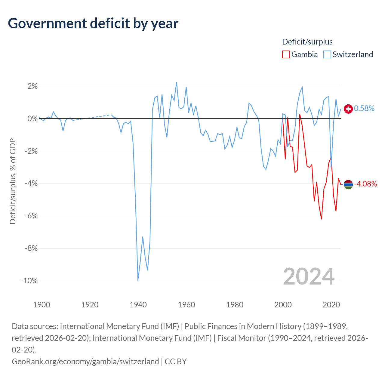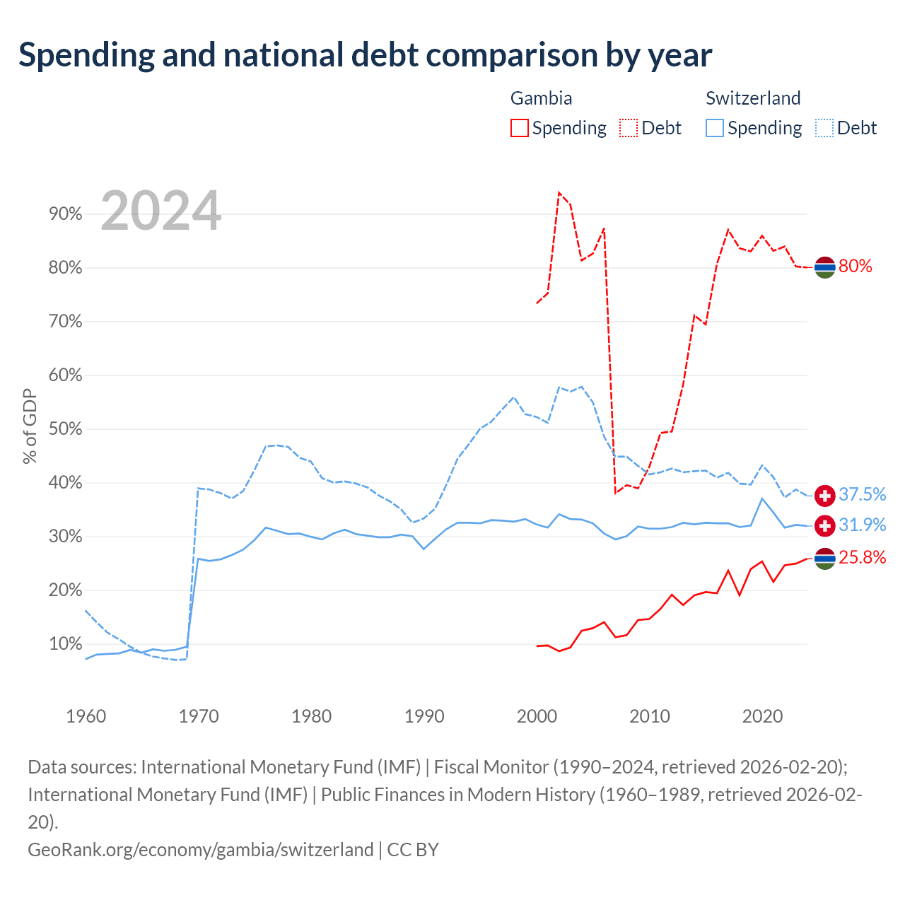 The Gambia has $1.92B in government debt (80% of GDP), compared to $351B (37.5% of GDP) in Switzerland.