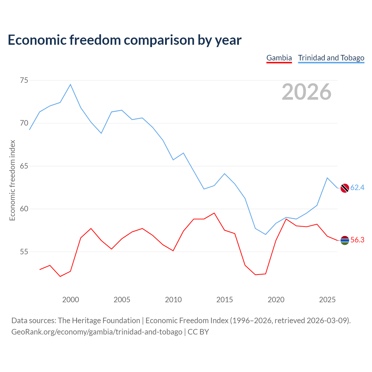 The Economic Freedom Index for the Gambia is 56.3, ranking 123/197, compared to 62.4 for Trinidad and Tobago, ranking 87/197. The chart above displays a comparison of annual changes in economic freedom indexes.