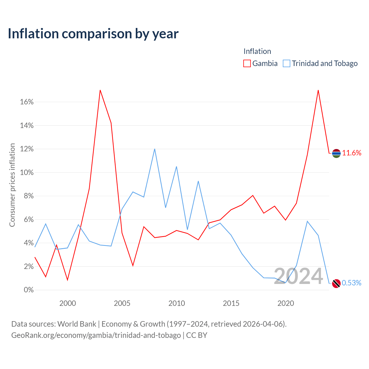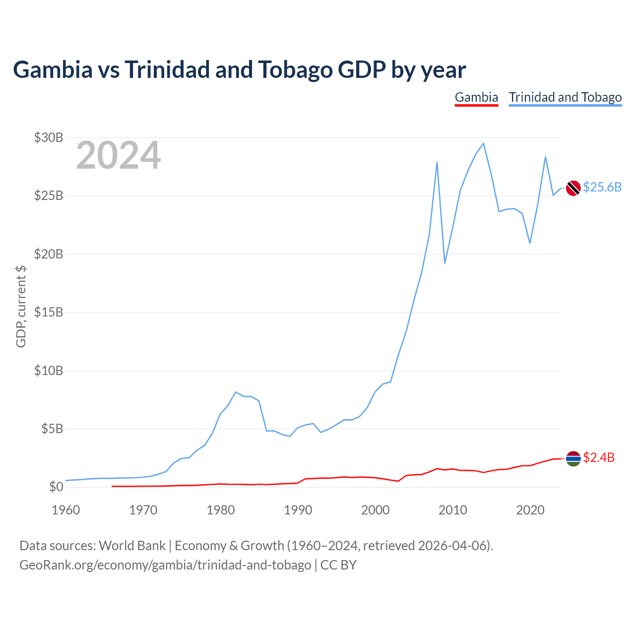 The Gambia has a GDP of $2.4B compared to $25.6B for Trinidad and Tobago, ranking 174/197 and 115/197 by economy size, respectively.
