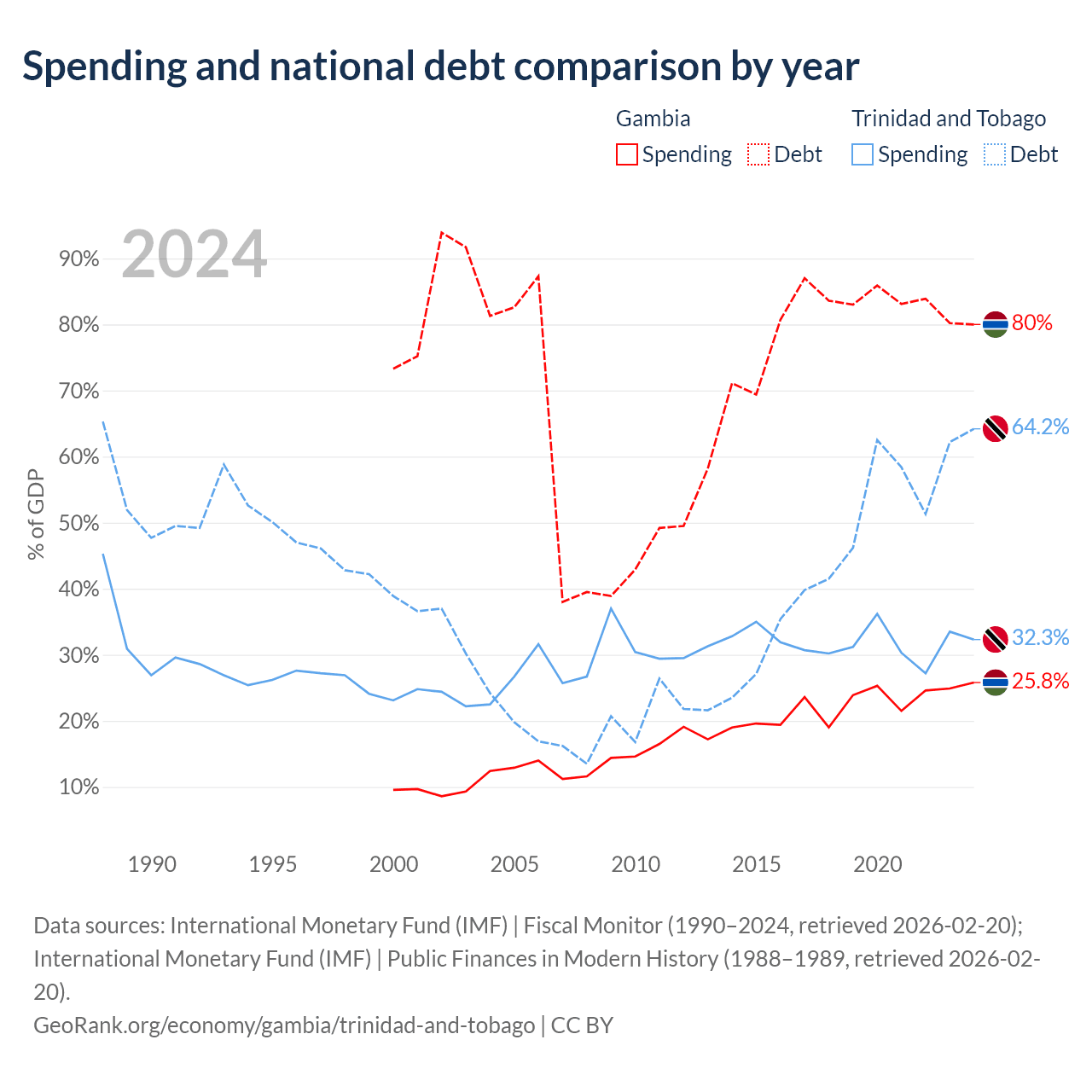 The Gambia has $1.92B in government debt (80% of GDP), compared to $16.5B (64.2% of GDP) in Trinidad and Tobago.