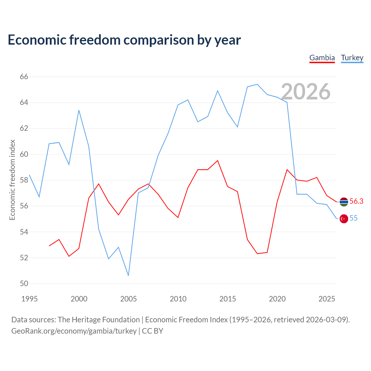 The Economic Freedom Index for the Gambia is 56.3, ranking 123/197, compared to 55 for Turkey, ranking 129/197. The chart above displays a comparison of annual changes in economic freedom indexes.