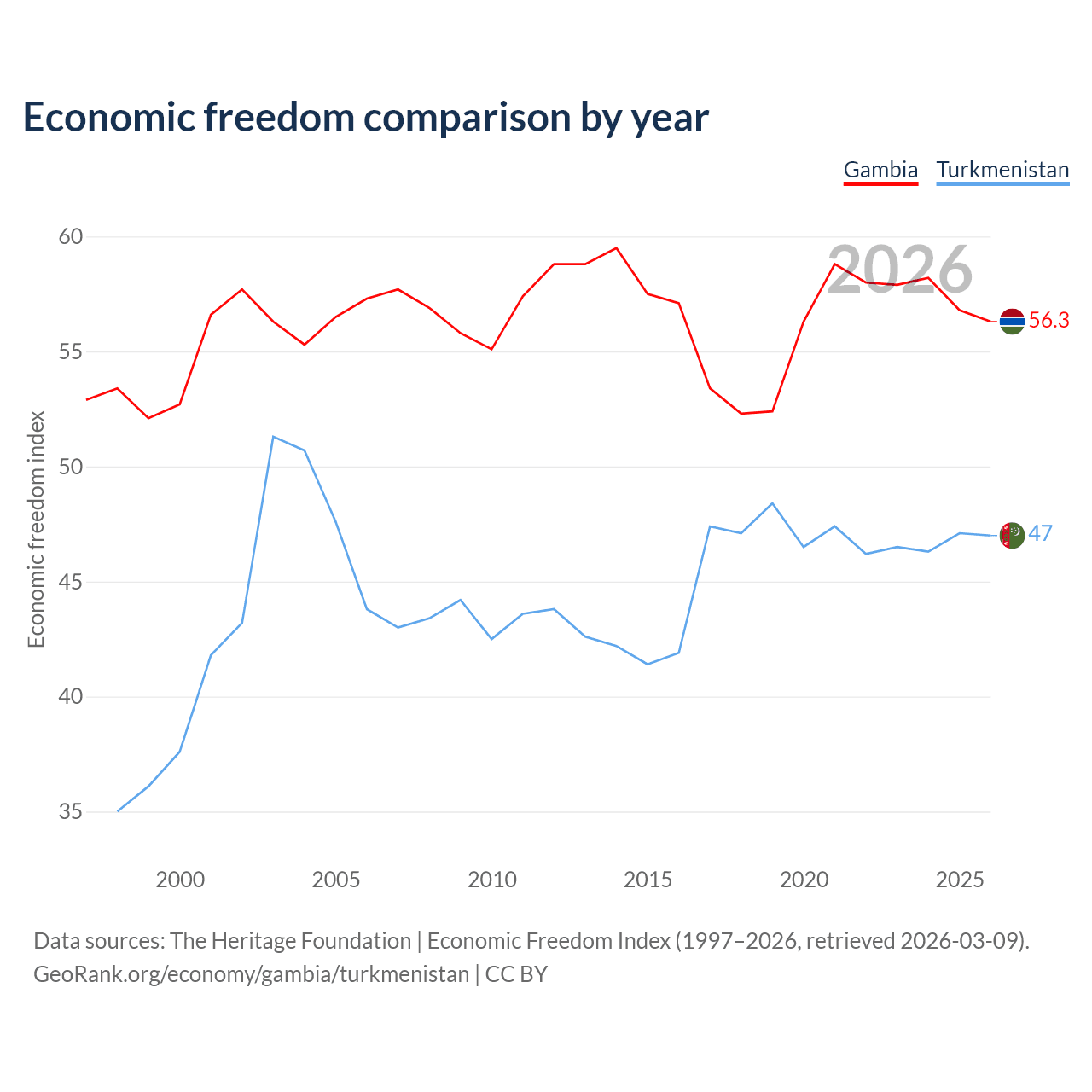 The Economic Freedom Index for the Gambia is 56.3, ranking 123/197, compared to 47 for Turkmenistan, ranking 177/197. The chart above displays a comparison of annual changes in economic freedom indexes.