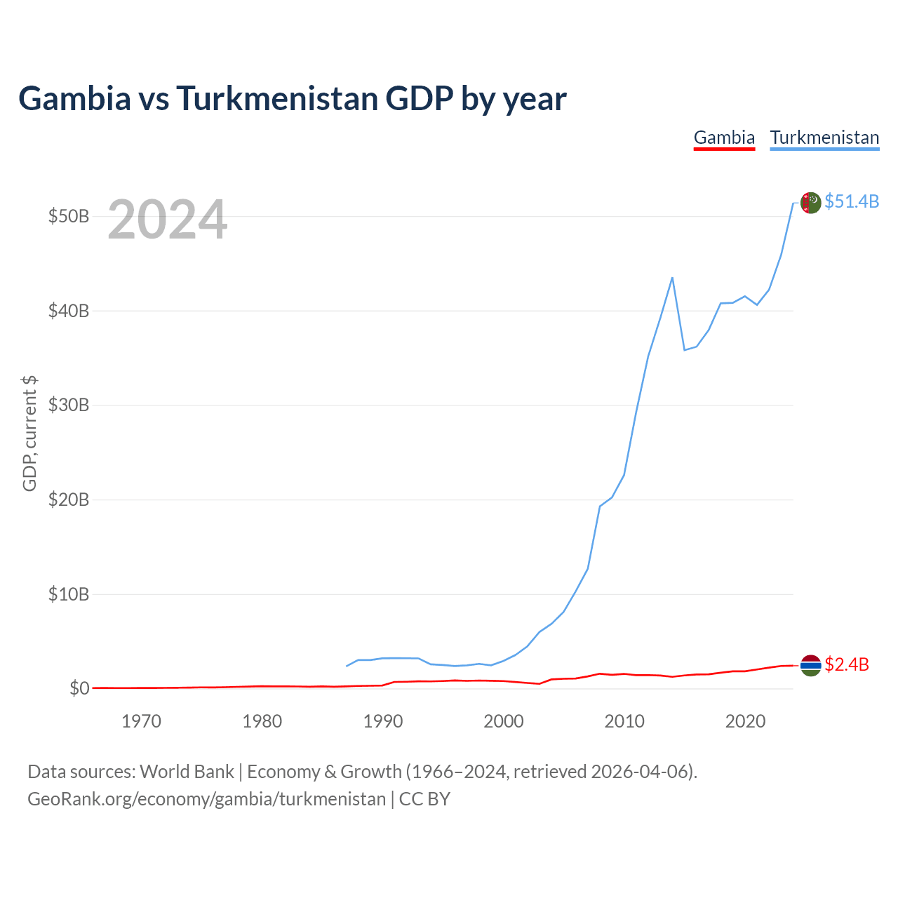 The Gambia has a GDP of $2.4B compared to $51.4B for Turkmenistan, ranking 174/197 and 92/197 by economy size, respectively.