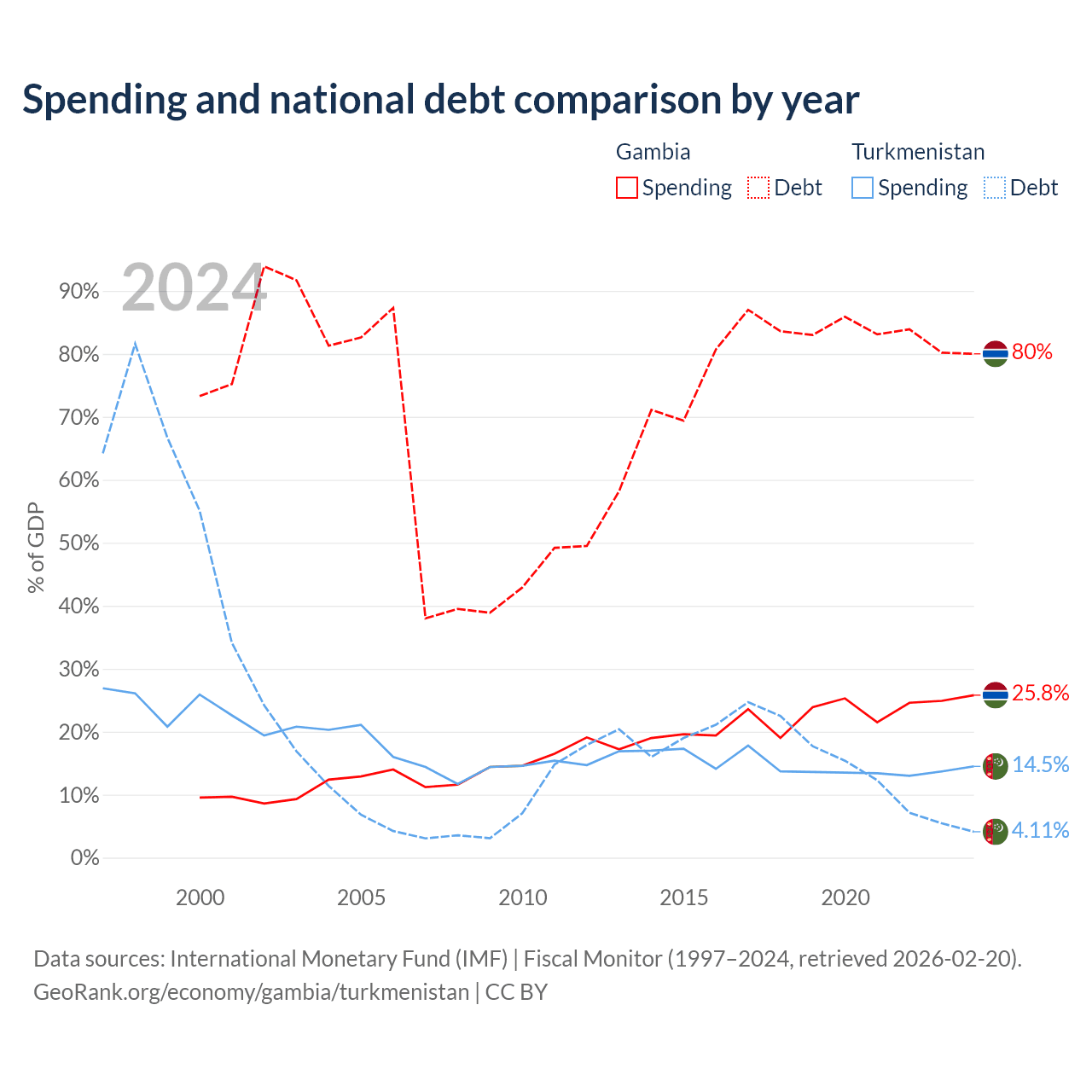 The Gambia has $1.92B in government debt (80% of GDP), compared to $2.11B (4.11% of GDP) in Turkmenistan.