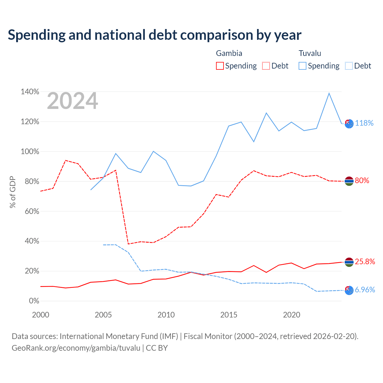 The Gambia has $1.92B in government debt (80% of GDP), compared to $4.15M (6.96% of GDP) in Tuvalu.
