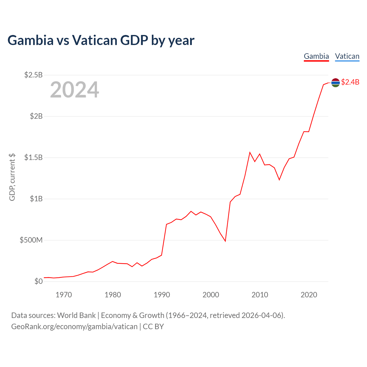 The Gambia has a GDP of $2.4B compared to $19.8M for the Vatican, ranking 174/197 and 197/197 by economy size, respectively.