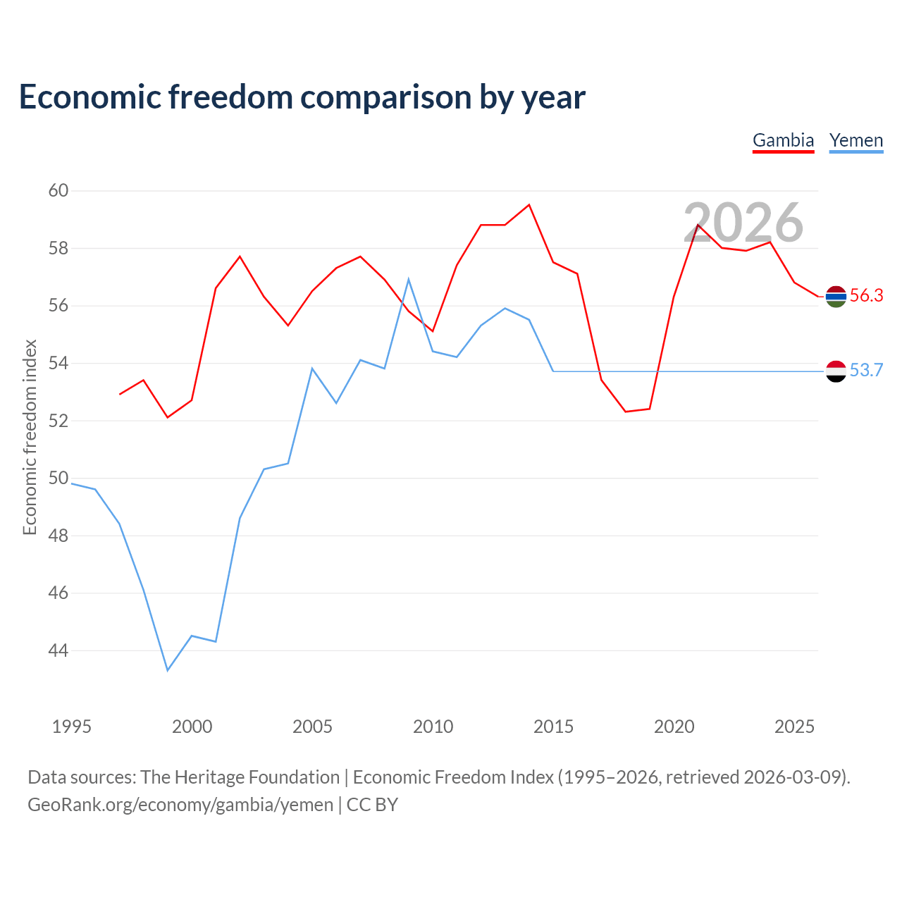 The Economic Freedom Index for the Gambia is 56.3, ranking 123/197, compared to 53.7 for Yemen, ranking 138/197. The chart above displays a comparison of annual changes in economic freedom indexes.