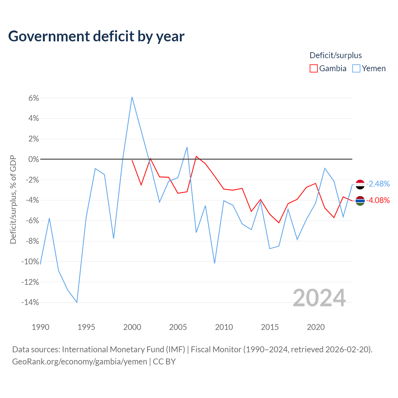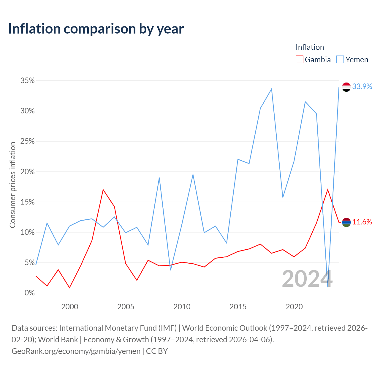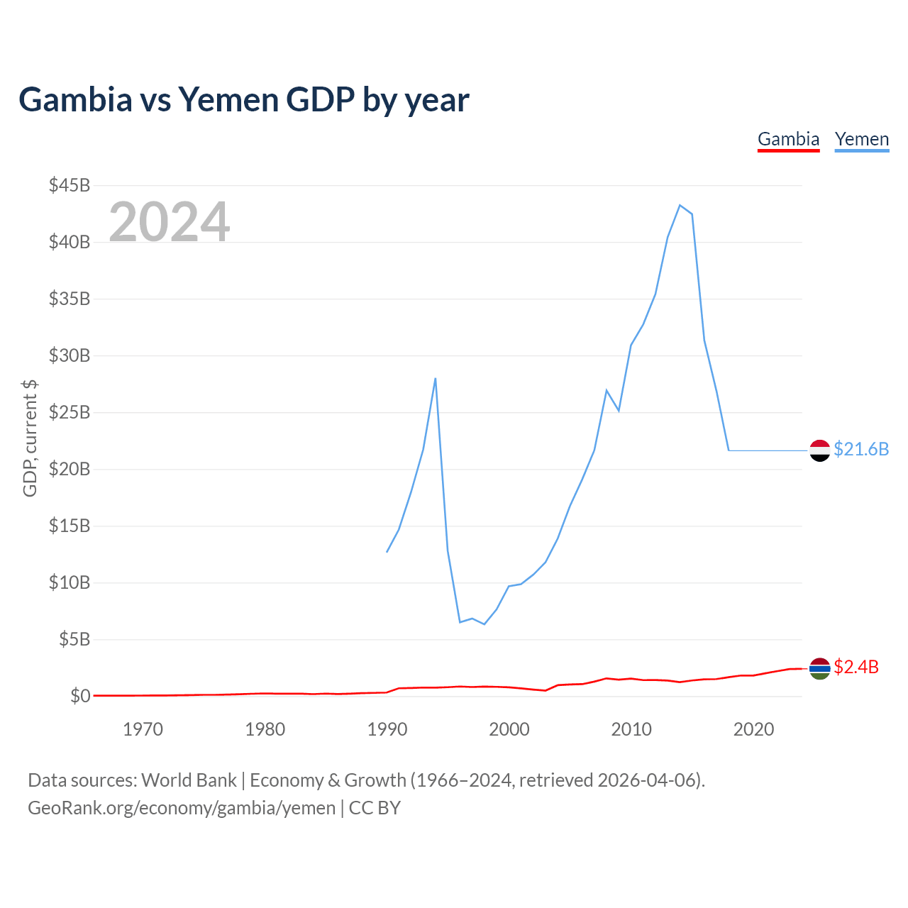 The Gambia has a GDP of $2.4B compared to $21.6B for Yemen, ranking 174/197 and 125/197 by economy size, respectively.