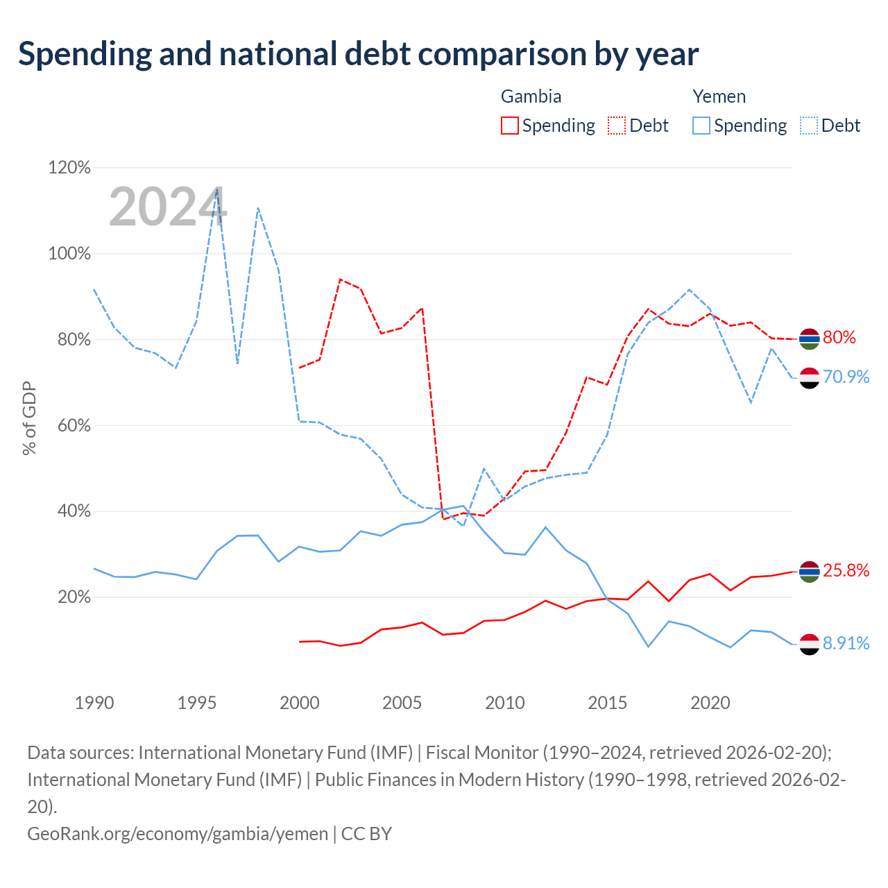 The Gambia has $1.92B in government debt (80% of GDP), compared to $18.8B (70.9% of GDP) in Yemen.