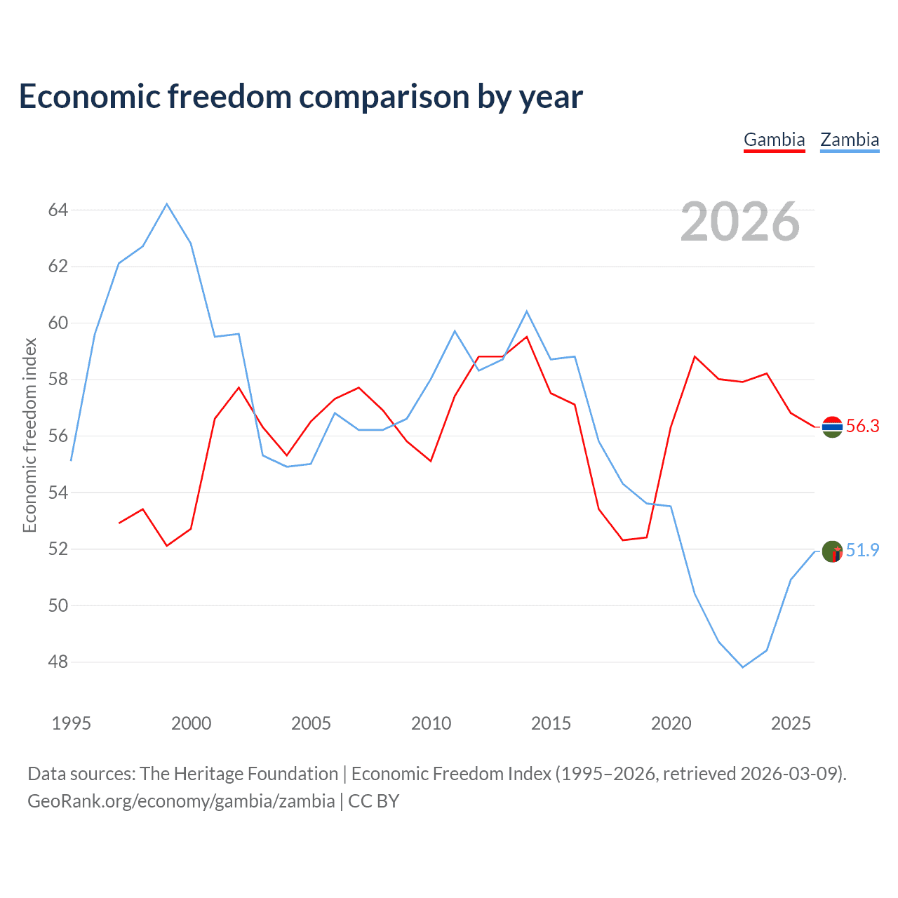 The Economic Freedom Index for the Gambia is 56.3, ranking 123/197, compared to 51.9 for Zambia, ranking 152/197. The chart above displays a comparison of annual changes in economic freedom indexes.