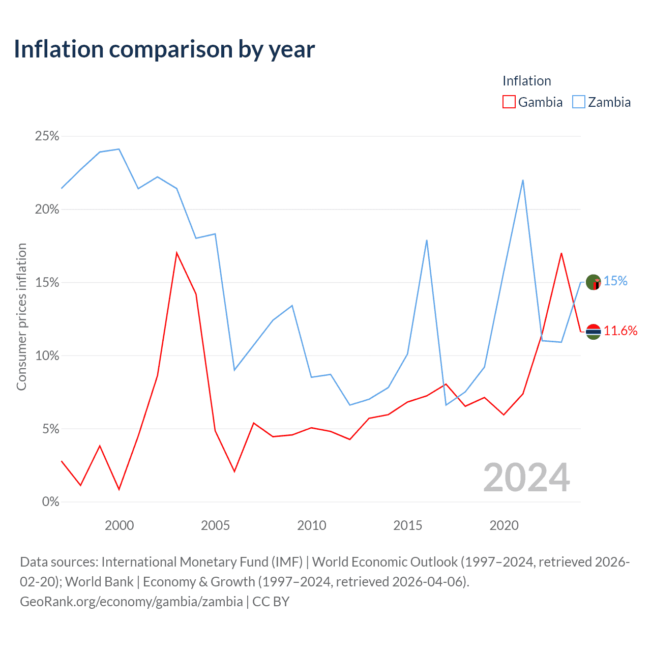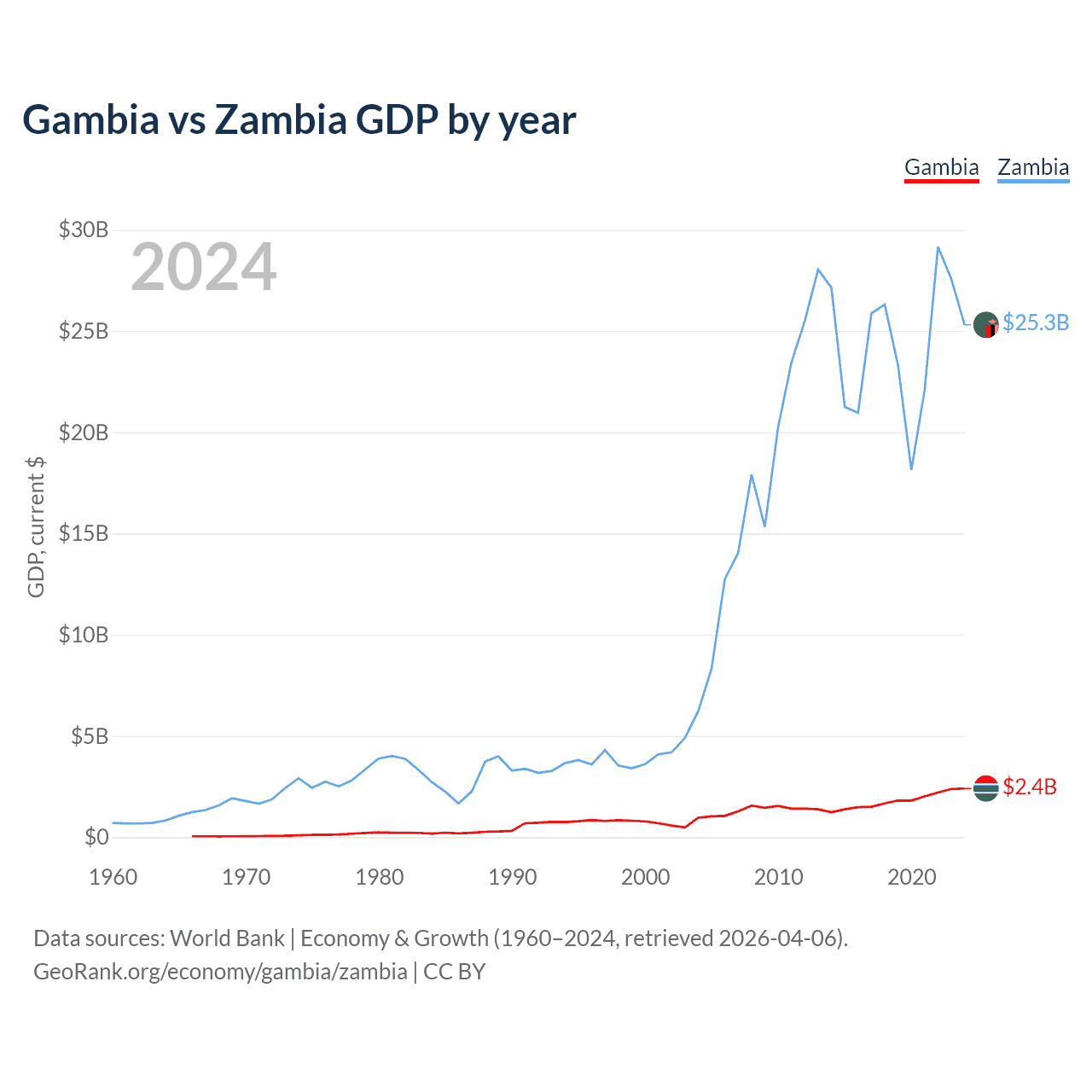The Gambia has a GDP of $2.4B compared to $25.3B for Zambia, ranking 174/197 and 116/197 by economy size, respectively.