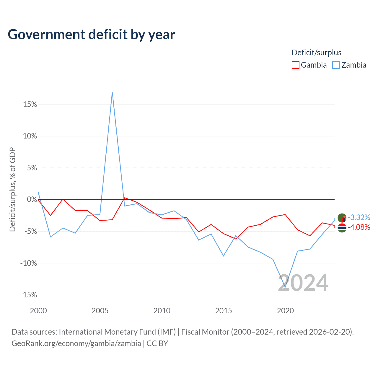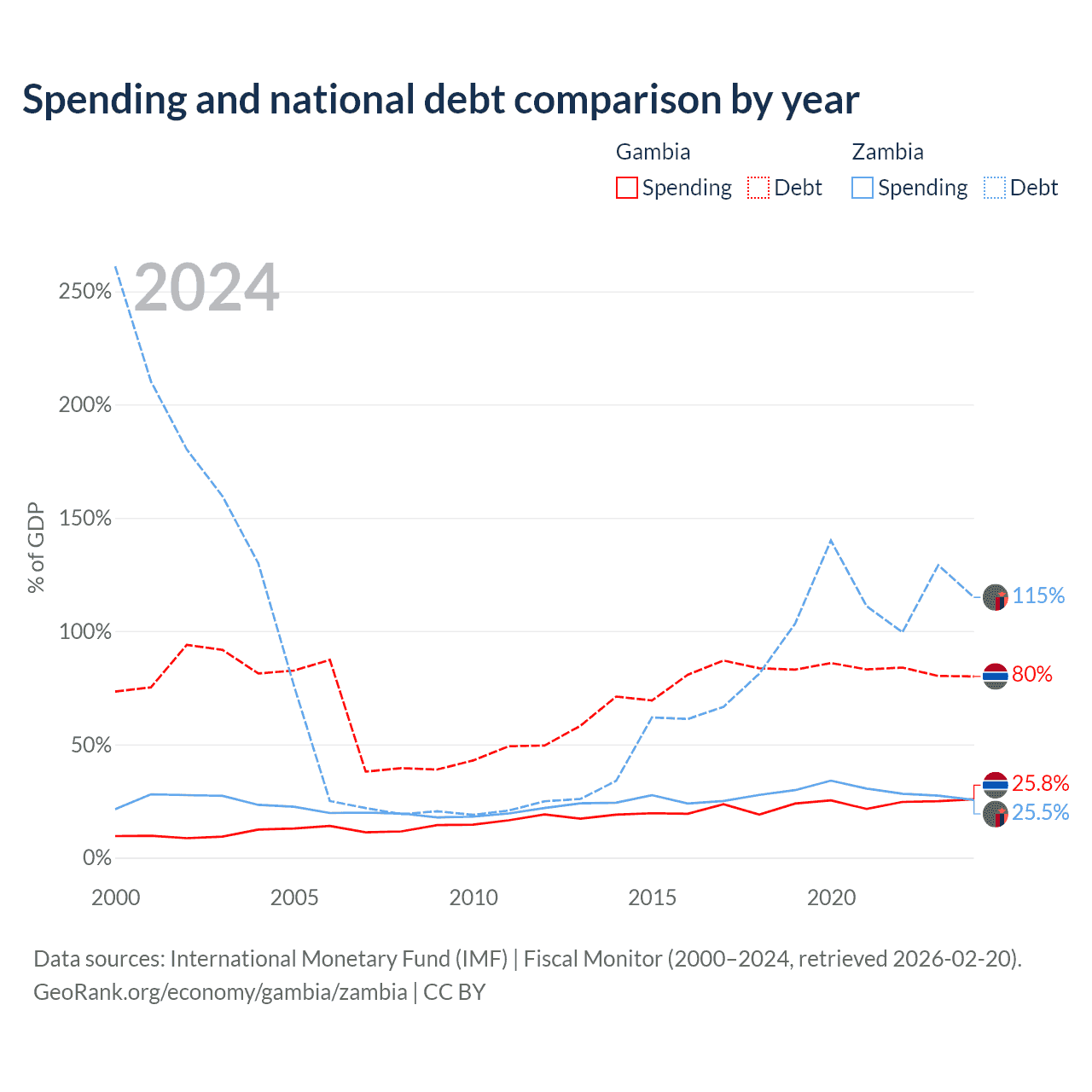 The Gambia has $1.92B in government debt (80% of GDP), compared to $29.1B (114.9% of GDP) in Zambia.