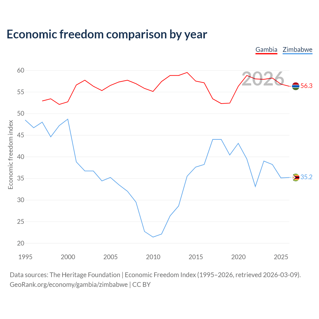 The Economic Freedom Index for the Gambia is 56.3, ranking 123/197, compared to 35.2 for Zimbabwe, ranking 190/197. The chart above displays a comparison of annual changes in economic freedom indexes.