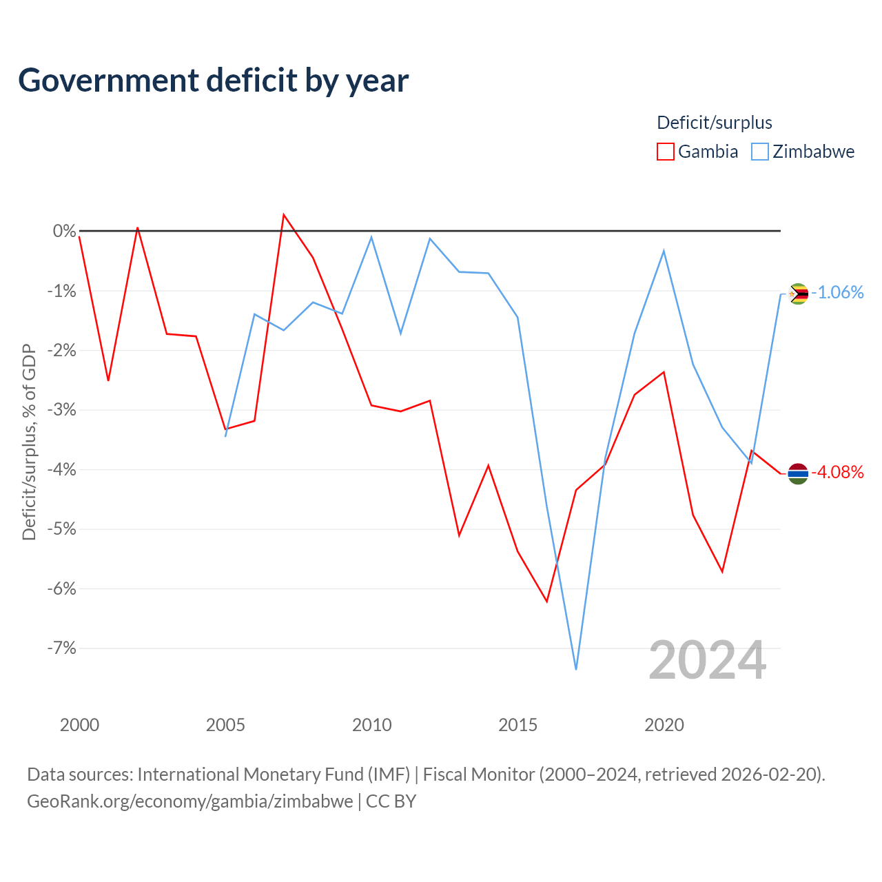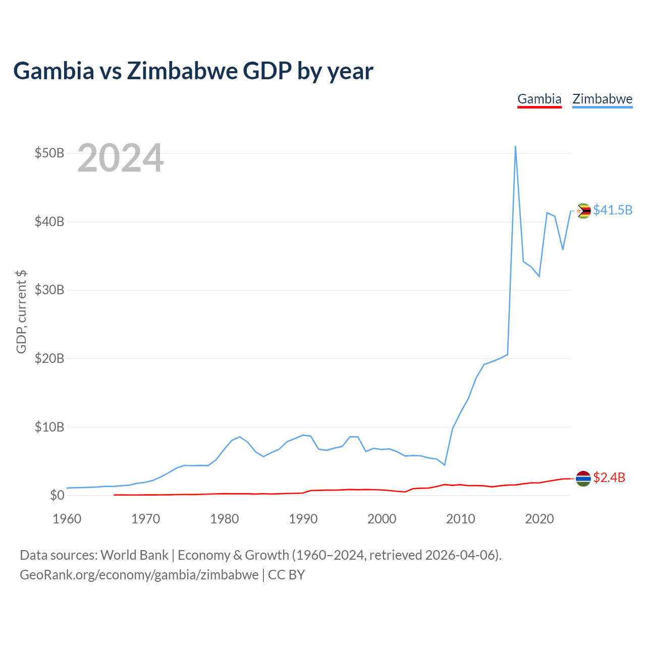 The Gambia has a GDP of $2.4B compared to $41.5B for Zimbabwe, ranking 174/197 and 102/197 by economy size, respectively.
