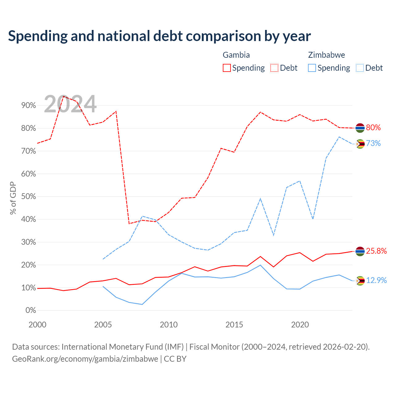 The Gambia has $1.92B in government debt (80% of GDP), compared to $30.3B (73% of GDP) in Zimbabwe.