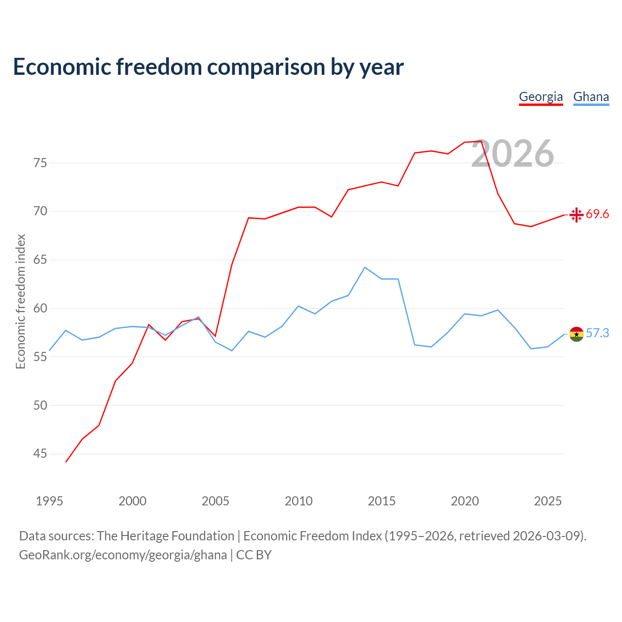 The Economic Freedom Index for Georgia is 69.6, ranking 41/197, compared to 57.3 for Ghana, ranking 118/197. The chart above displays a comparison of annual changes in economic freedom indexes.