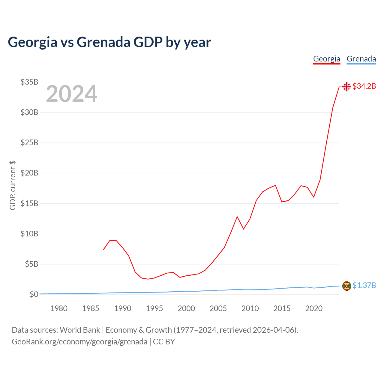 Georgia has a GDP of $34.2B compared to $1.37B for Grenada, ranking 107/197 and 184/197 by economy size, respectively.