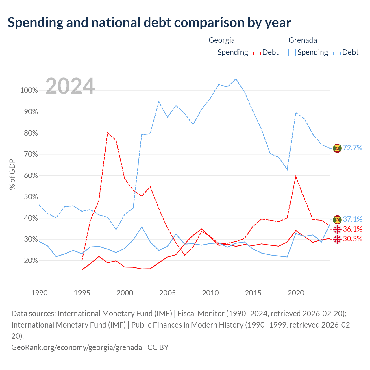 Georgia has $12.3B in government debt (36.1% of GDP), compared to $997M (72.7% of GDP) in Grenada.