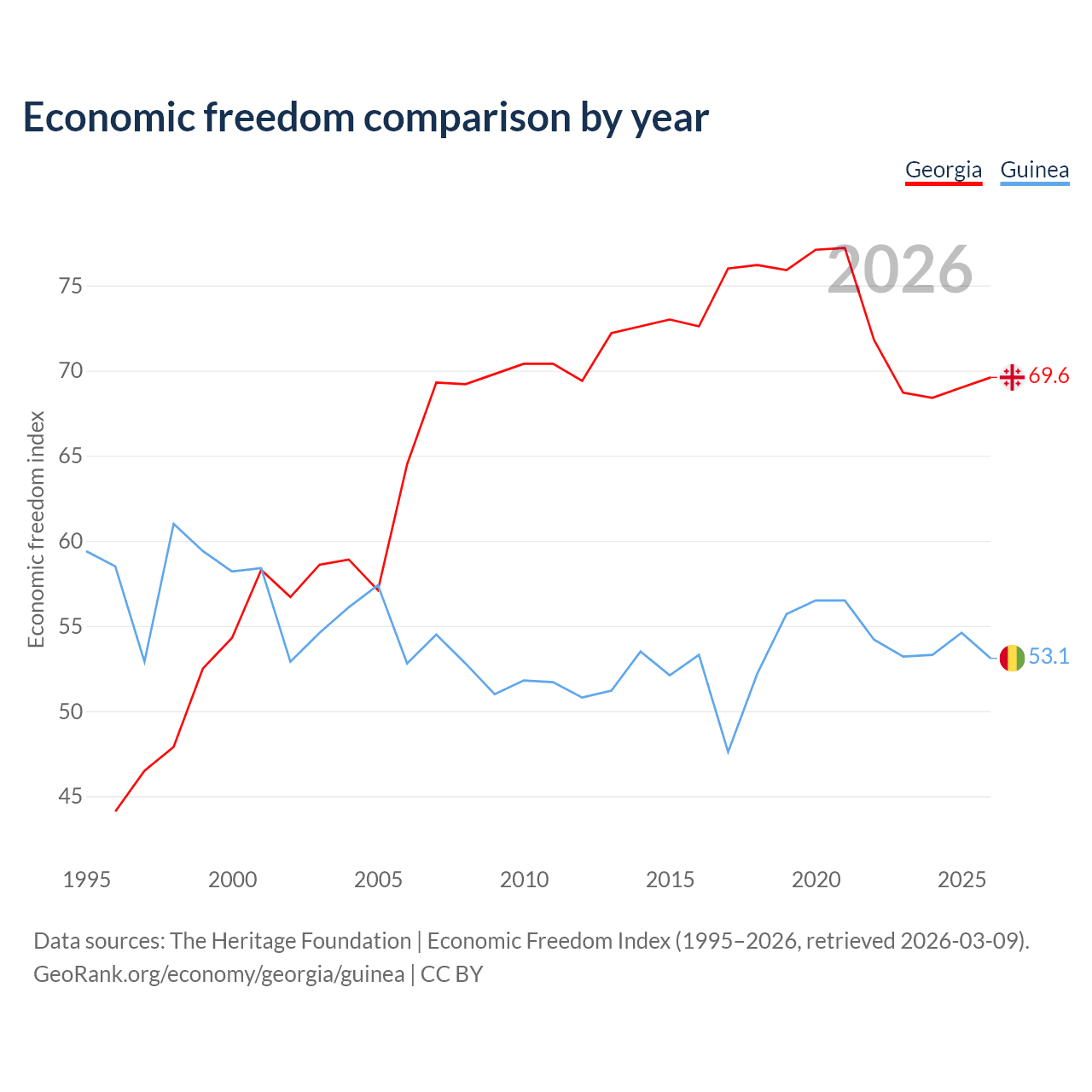 The Economic Freedom Index for Georgia is 69.6, ranking 41/197, compared to 53.1 for Guinea, ranking 141/197. The chart above displays a comparison of annual changes in economic freedom indexes.