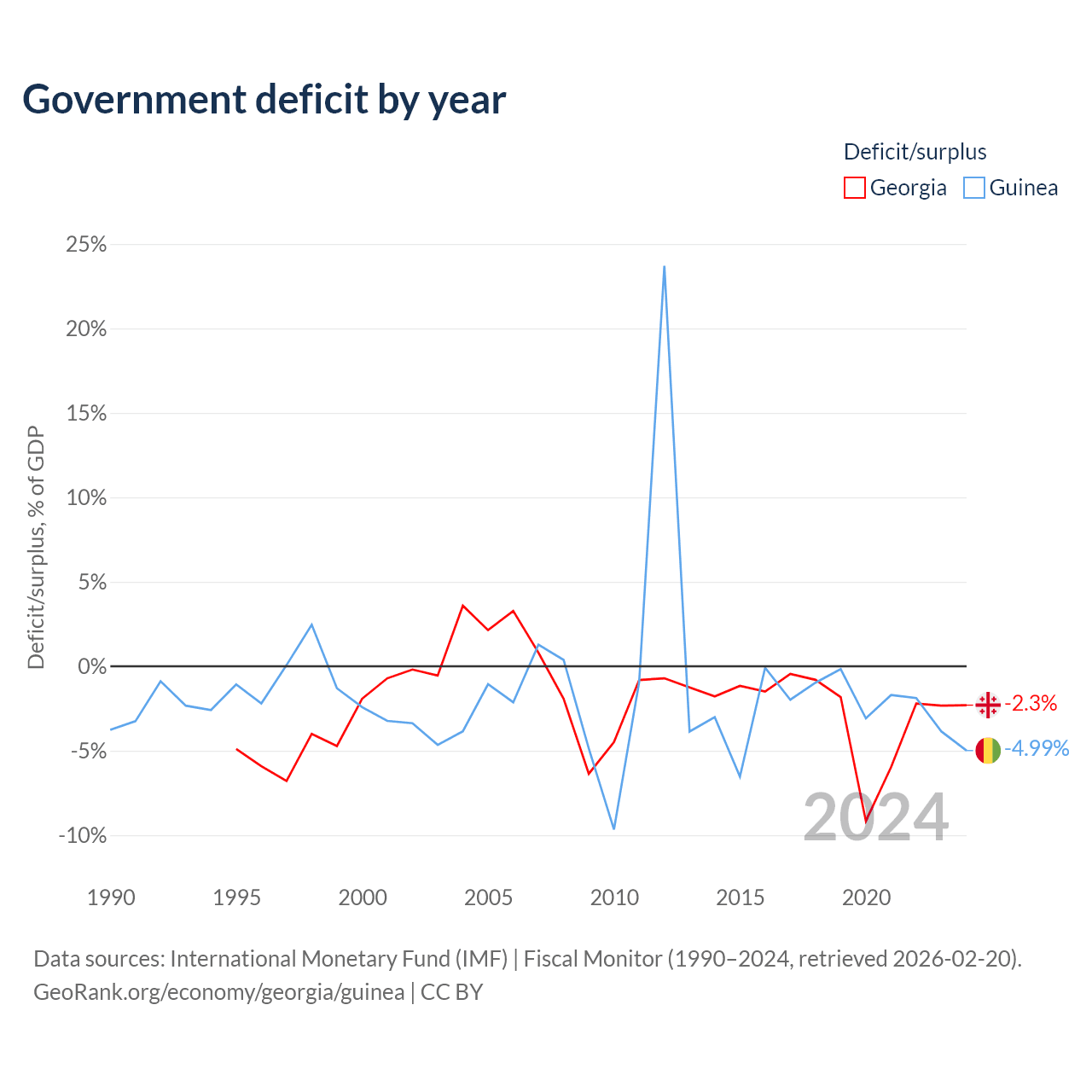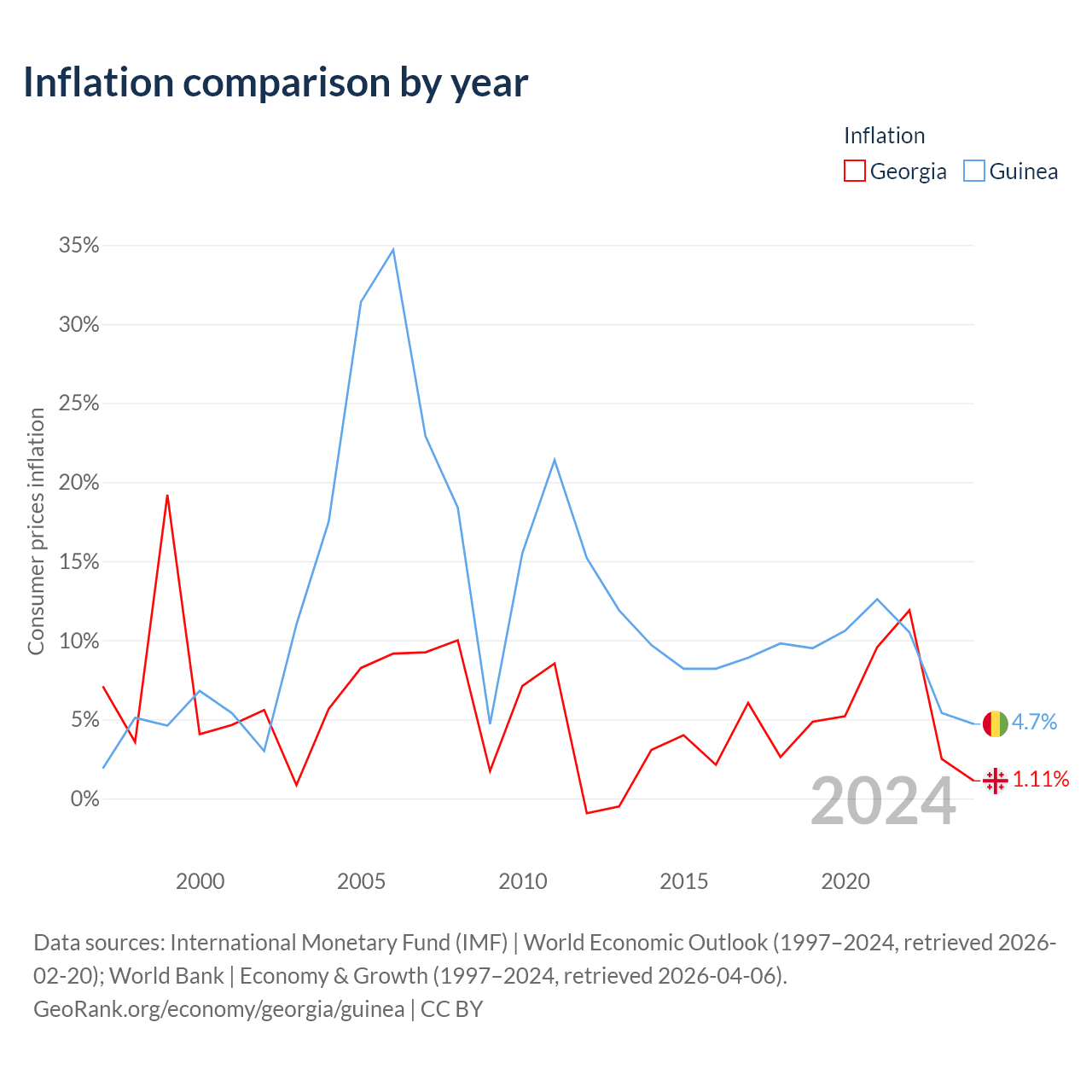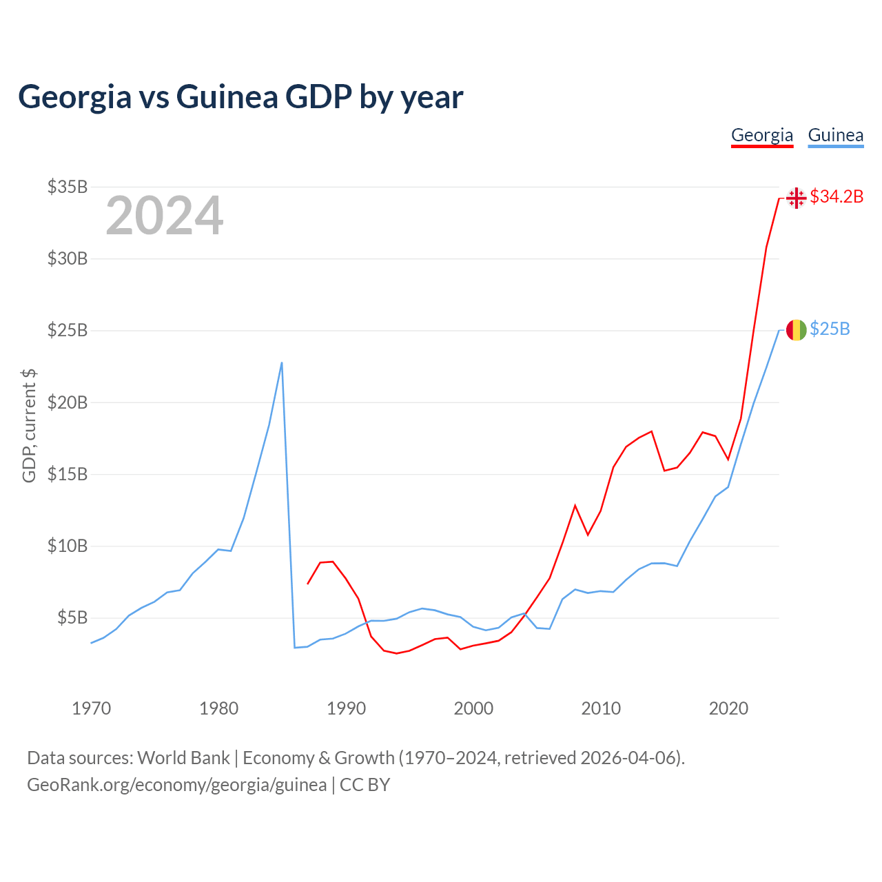 Georgia has a GDP of $34.2B compared to $25B for Guinea, ranking 107/197 and 118/197 by economy size, respectively.