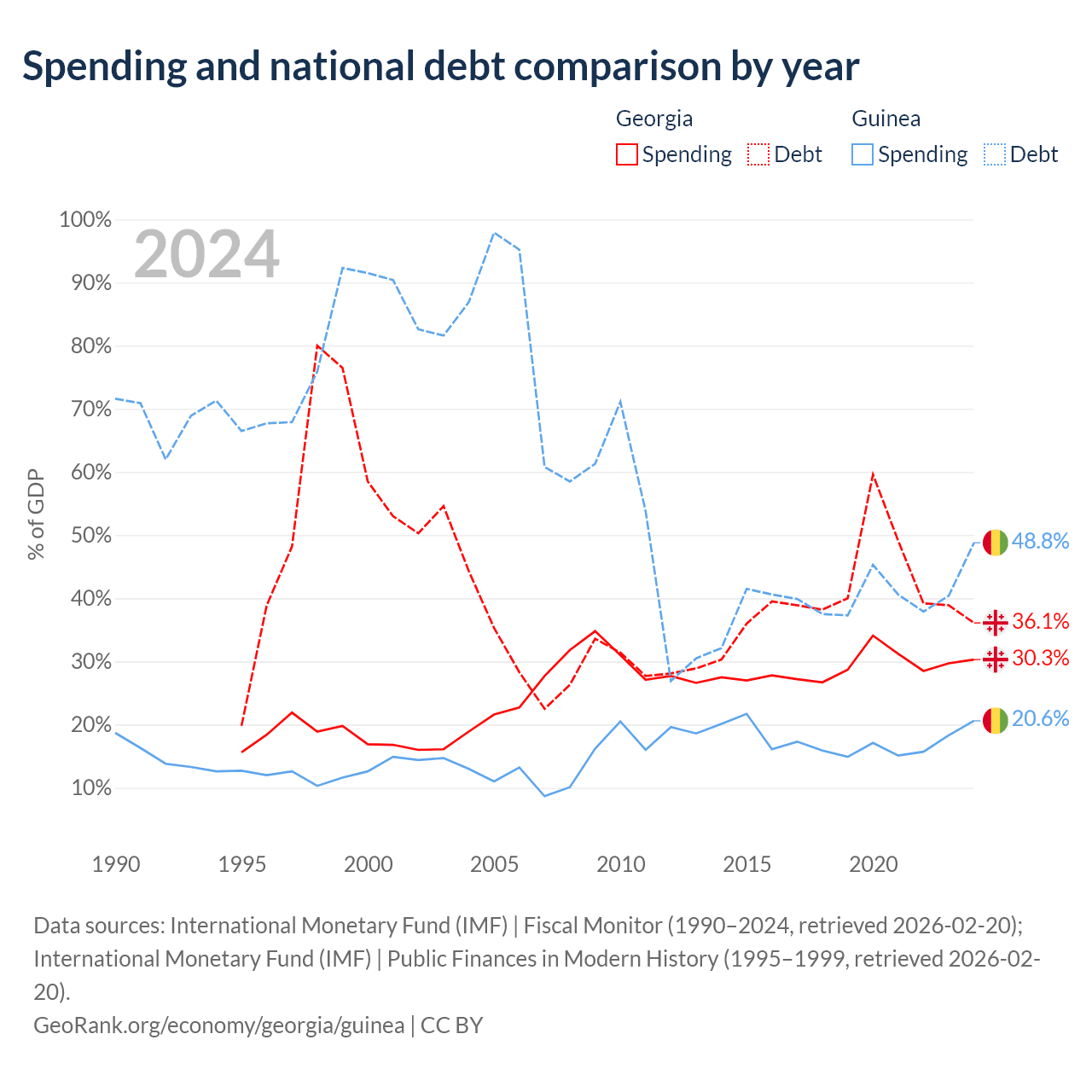 Georgia has $12.3B in government debt (36.1% of GDP), compared to $12.2B (48.8% of GDP) in Guinea.