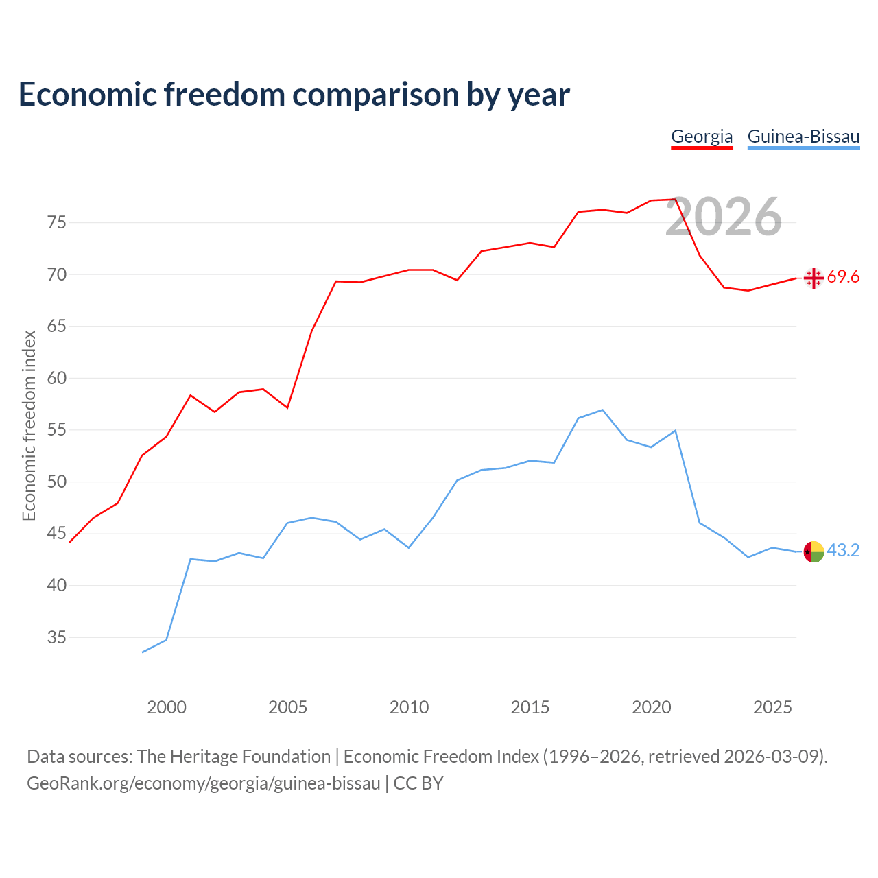 The Economic Freedom Index for Georgia is 69.6, ranking 41/197, compared to 43.2 for Guinea-Bissau, ranking 181/197. The chart above displays a comparison of annual changes in economic freedom indexes.