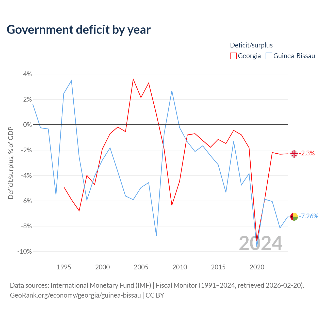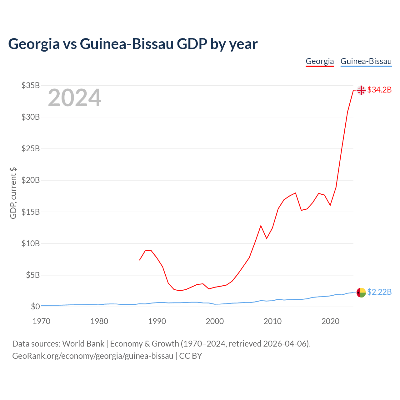 Georgia has a GDP of $34.2B compared to $2.22B for Guinea-Bissau, ranking 107/197 and 176/197 by economy size, respectively.