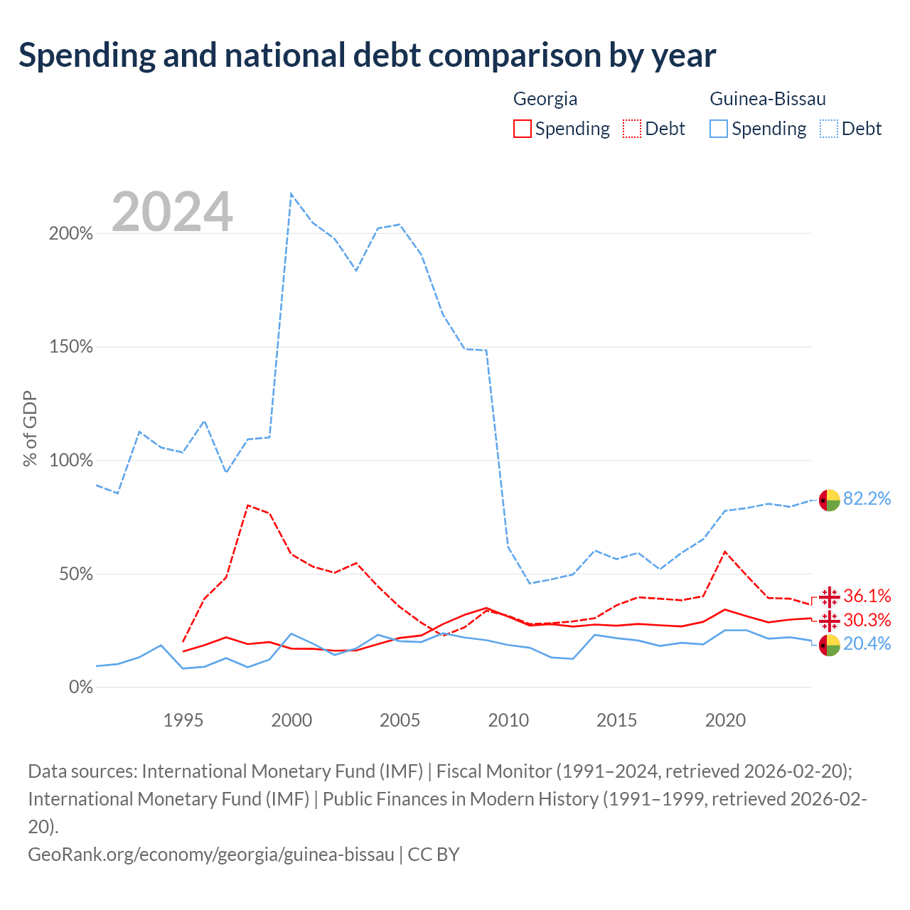 Georgia has $12.3B in government debt (36.1% of GDP), compared to $1.82B (82.2% of GDP) in Guinea-Bissau.