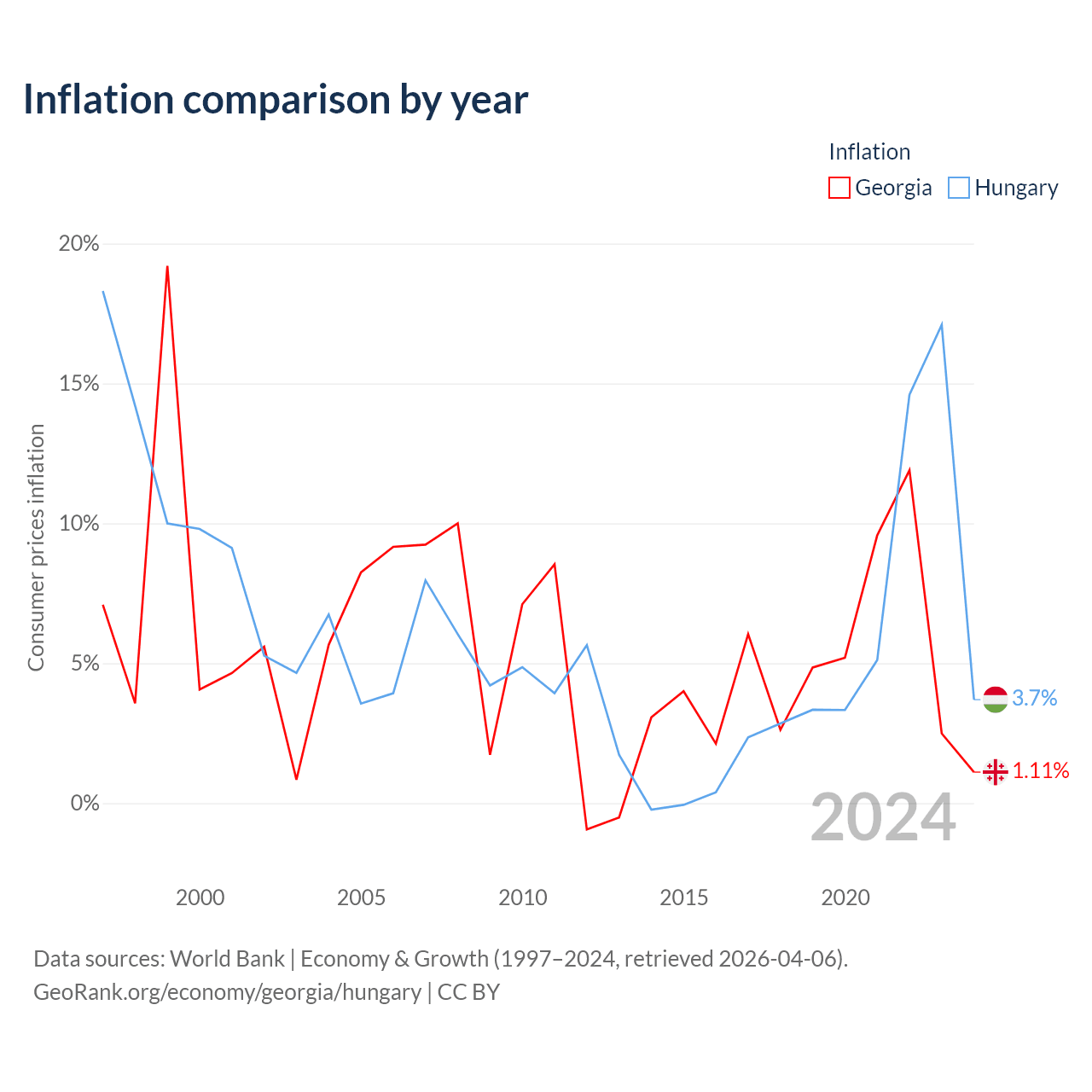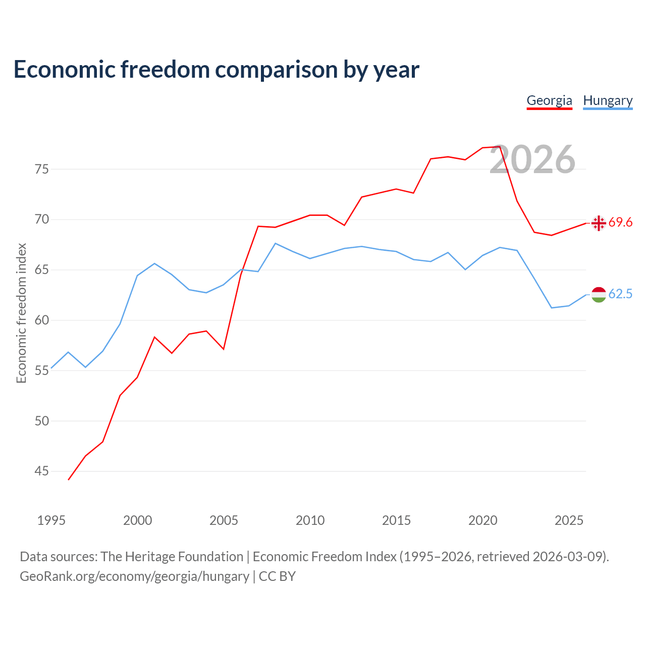 The Economic Freedom Index for Georgia is 69.6, ranking 41/197, compared to 62.5 for Hungary, ranking 86/197. The chart above displays a comparison of annual changes in economic freedom indexes.