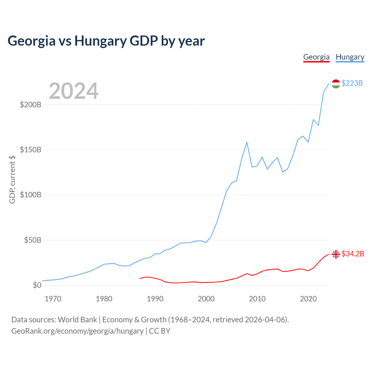 Georgia has a GDP of $34.2B compared to $223B for Hungary, ranking 107/197 and 55/197 by economy size, respectively.