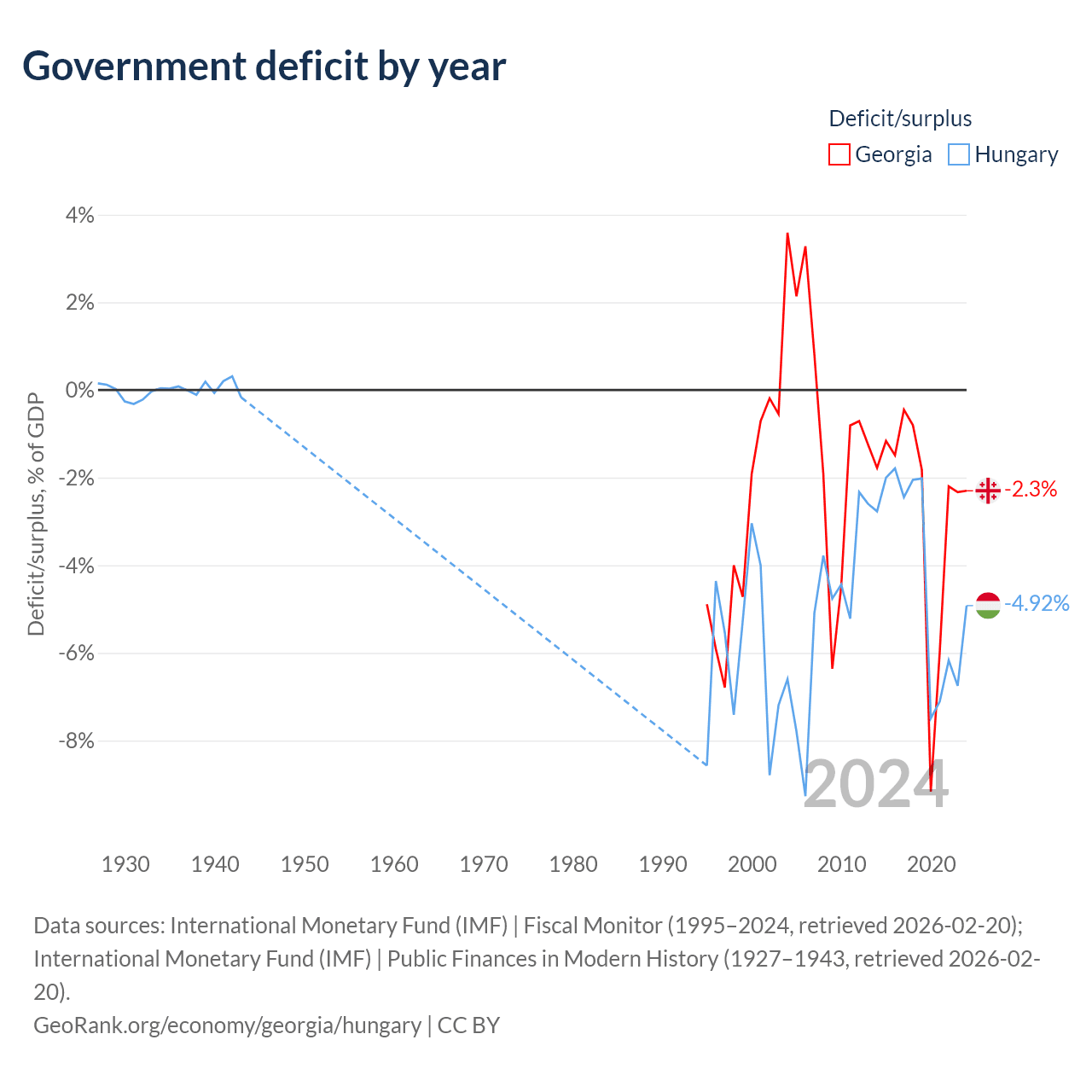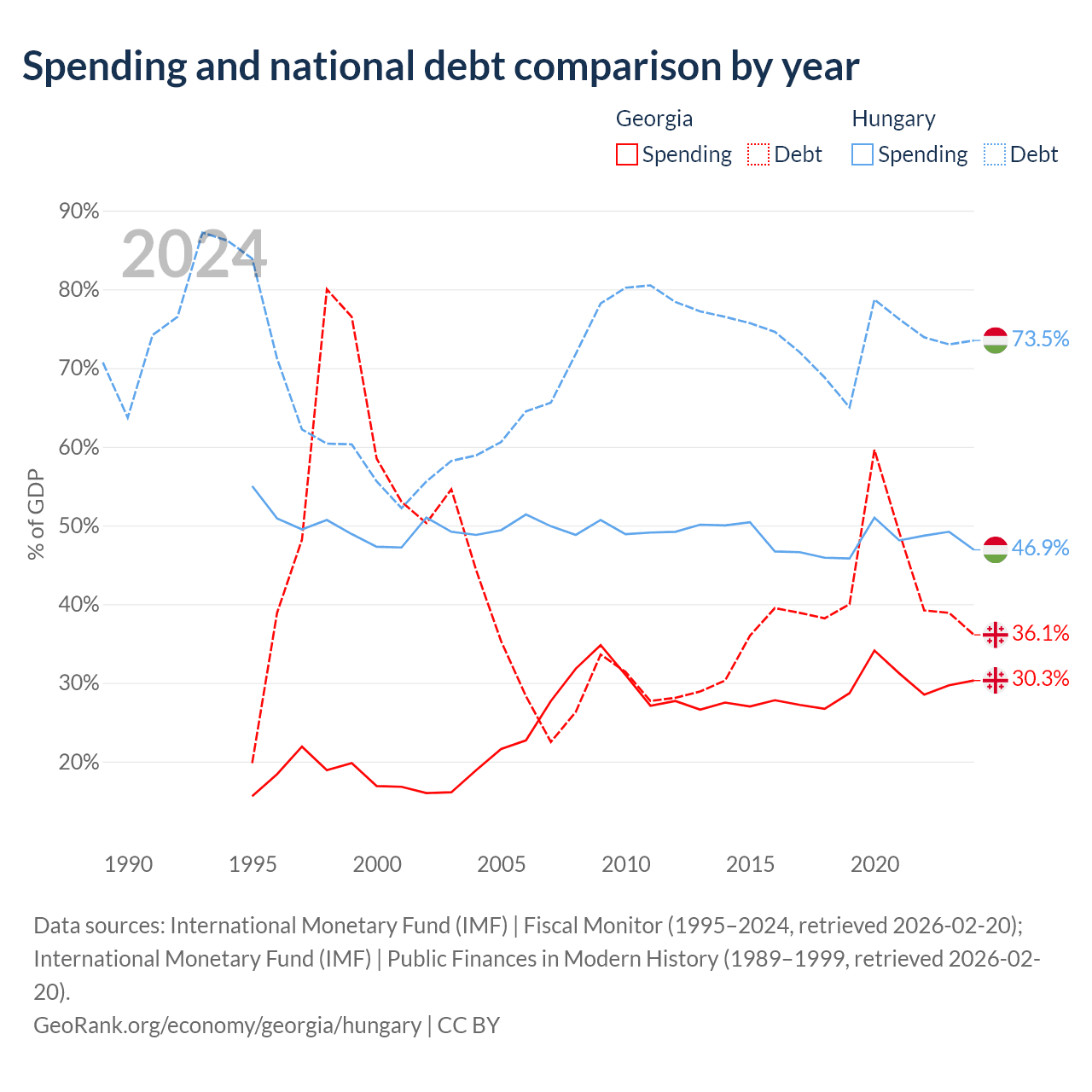 Georgia has $12.3B in government debt (36.1% of GDP), compared to $164B (73.5% of GDP) in Hungary.