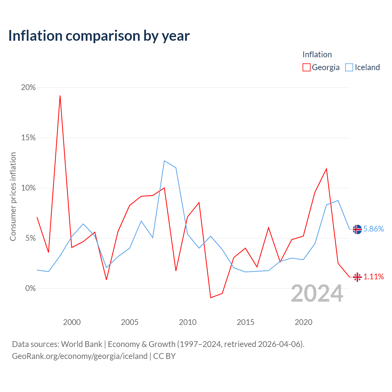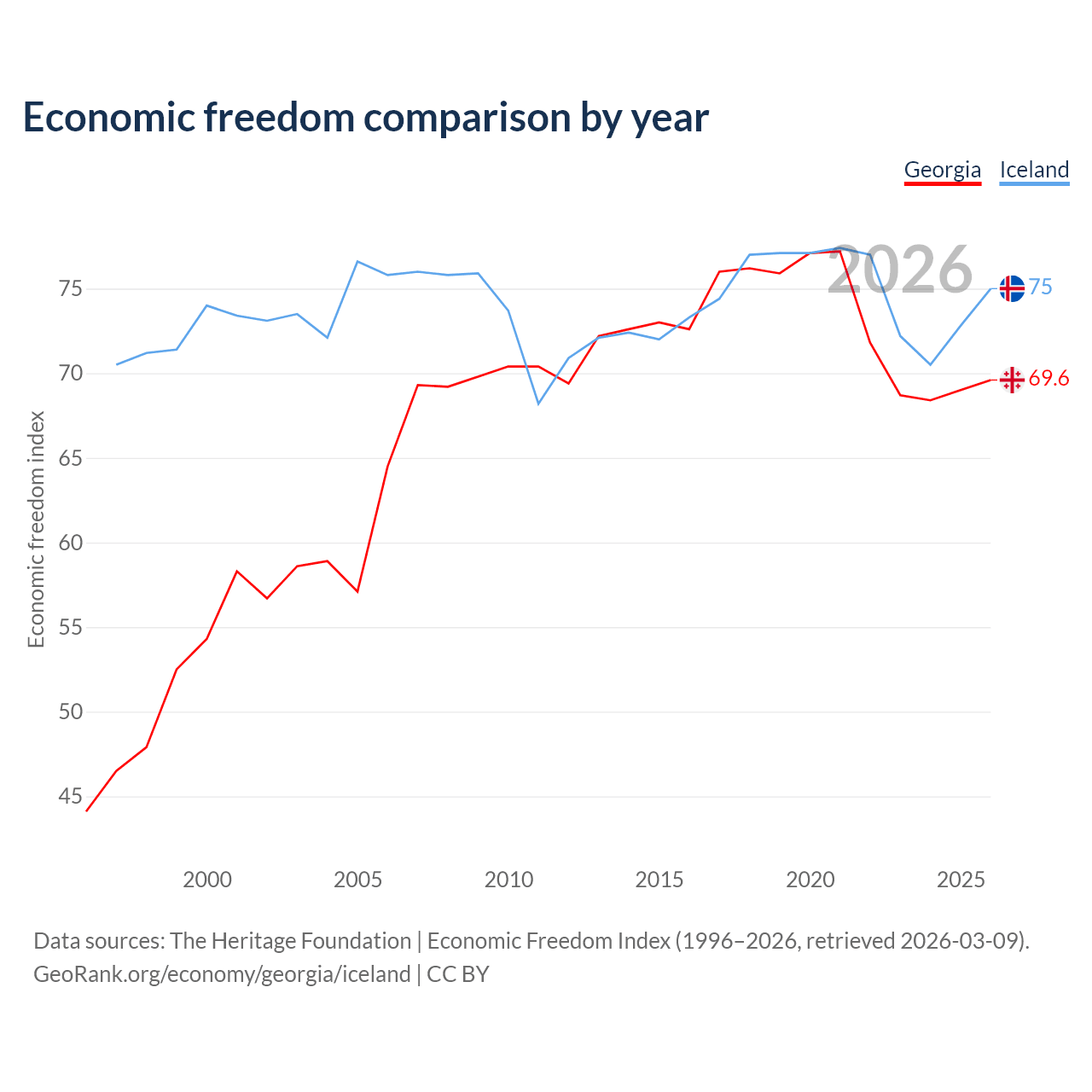 The Economic Freedom Index for Georgia is 69.6, ranking 41/197, compared to 75 for Iceland, ranking 19/197. The chart above displays a comparison of annual changes in economic freedom indexes.
