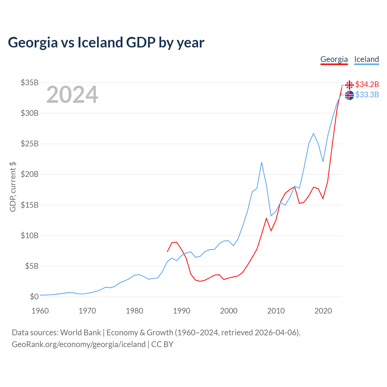 Georgia has a GDP of $34.2B compared to $33.3B for Iceland, ranking 107/197 and 108/197 by economy size, respectively.