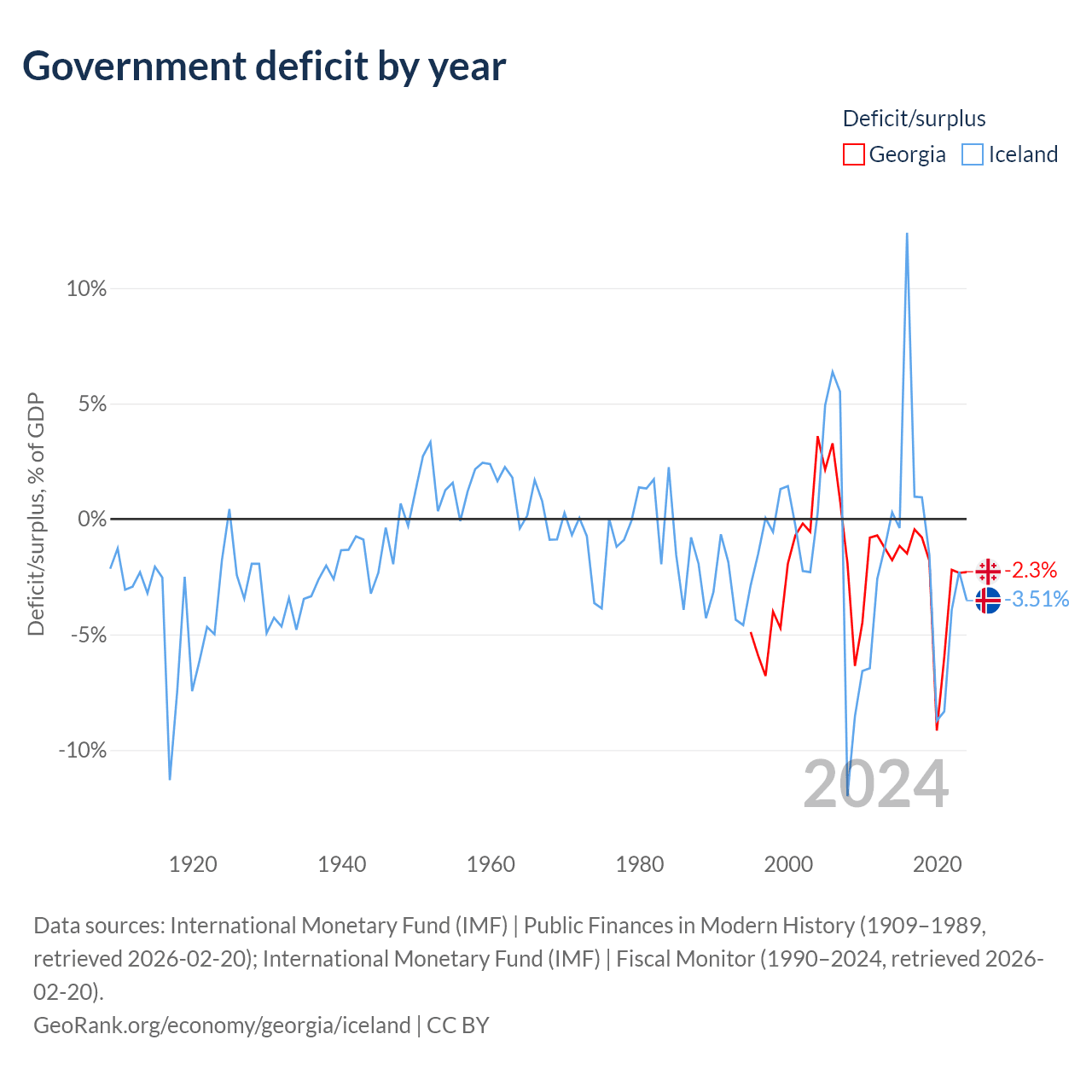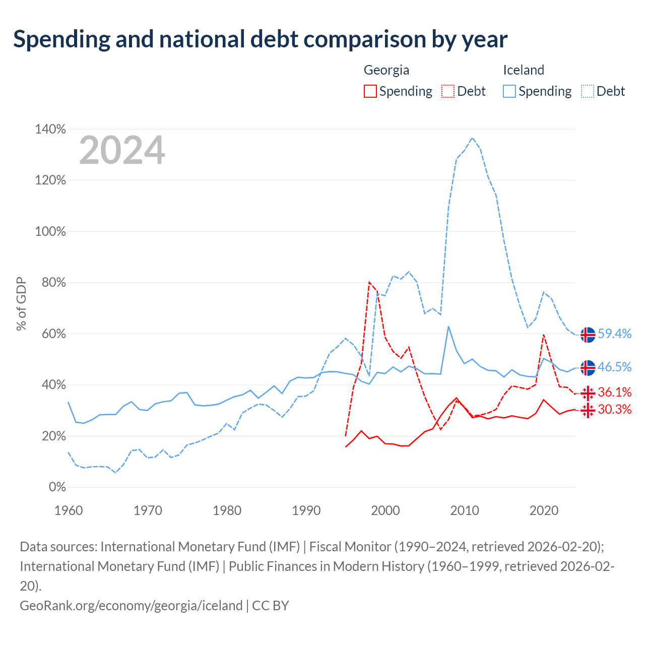 Georgia has $12.3B in government debt (36.1% of GDP), compared to $19.8B (59.4% of GDP) in Iceland.