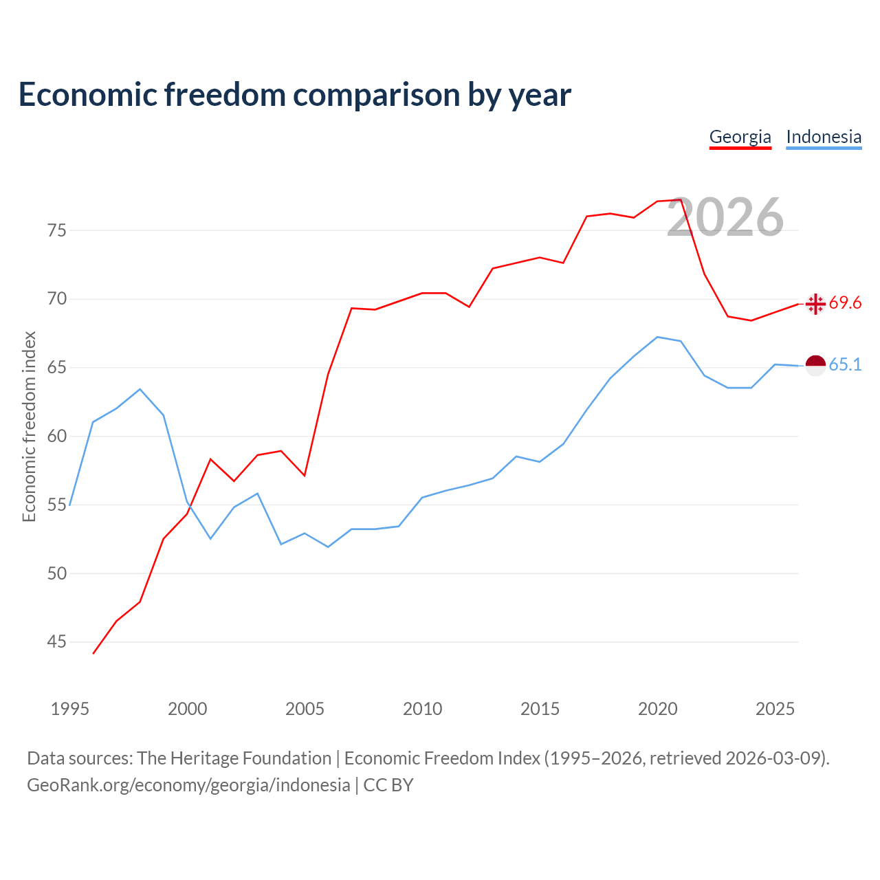The Economic Freedom Index for Georgia is 69.6, ranking 41/197, compared to 65.1 for Indonesia, ranking 67/197. The chart above displays a comparison of annual changes in economic freedom indexes.